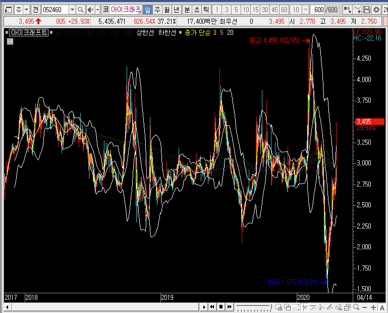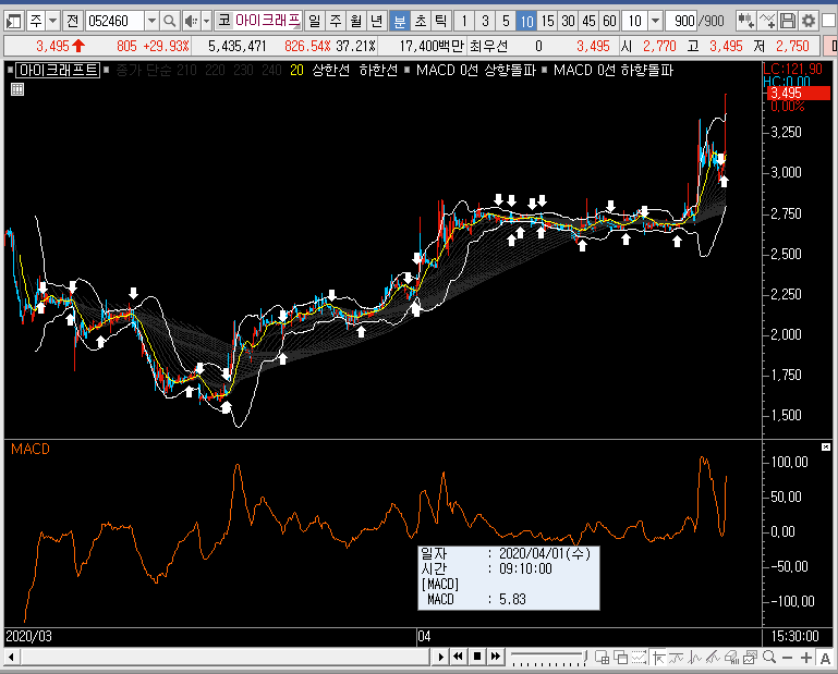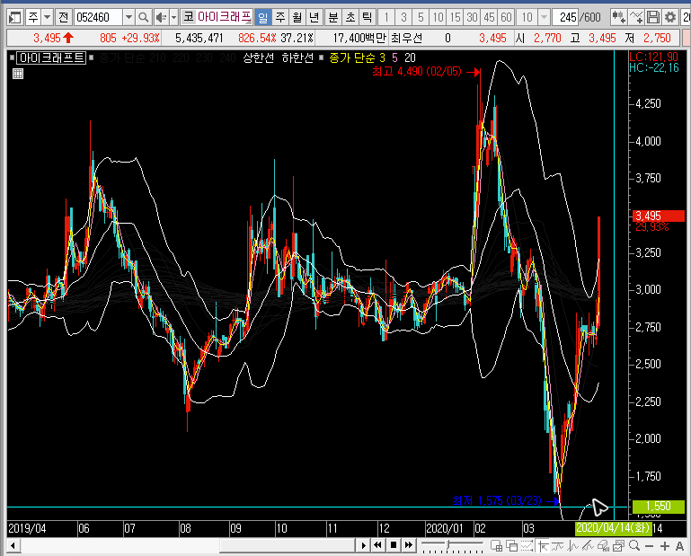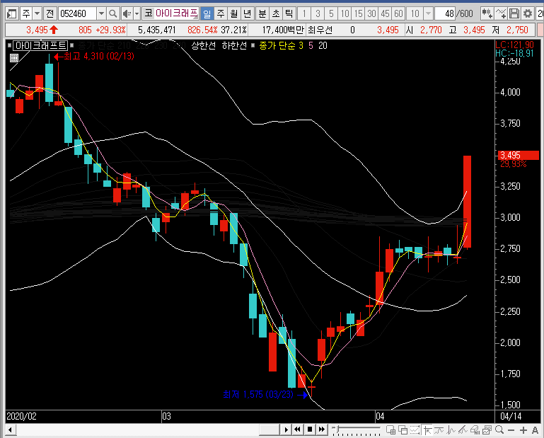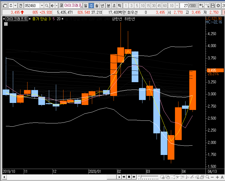 상승파를 계속 그려나가면서 주봉차트의 밴드 상단선을 건드린 이후에도 역시에 단기선이 가파른 각도를 유지한다면, 같은 방식으로 아이크래프트를 공략해볼 수 있을 것 같습니다. 계속 쪼개서 가져가는 것이죠.