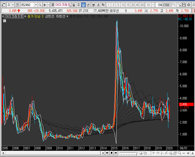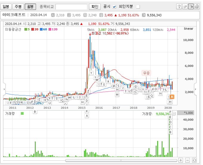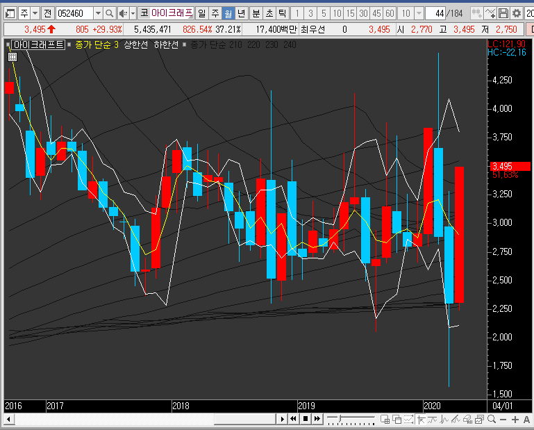 그렇기 때문에 이 종목은 차트를 보면서 대응을 한다면 분명 좋은 결과가 있을 것이라 생각합니다. 그런 의미에서 월봉차트로 아이크래프트의 주가를 보면 하락 후 횡보하다 변동성을 키우는 모습이 보입니다.
