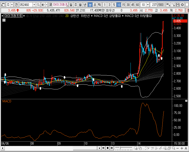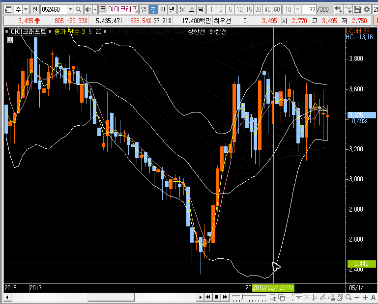 이번 달에는 꽤나 큰 양봉을 그리고 있는데, 이 상태로 양봉마감을 할 확률이 더 높을 것으로 보입니다. 그리고 밴드 상단까지 열린 상태이기 때문에 아이크래프트의 주가는 추가적인 상승도 있을 것이라 봅니다.