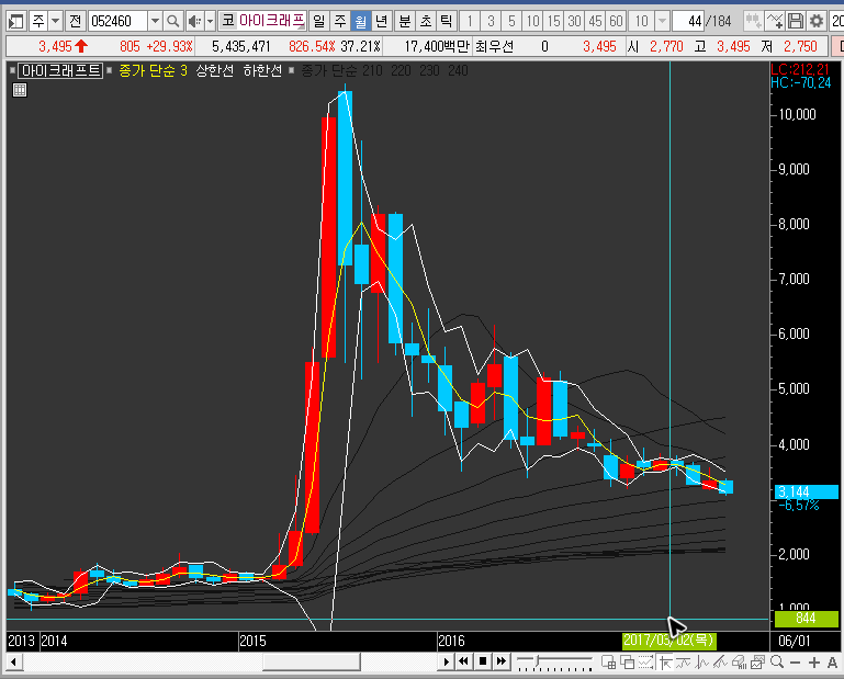 밑에서 포지션을 이미 잡으신 분들이라면 일부분을 정리할 것도 없을 것 같습니다. 주봉차트에서 아이크래프트의 주가가 밴드 상단선을 건드릴 때부터 정리하기 시작하면 될 것 같습니다. 오르면 조금씩 줄여가는 방식이 적당하겠죠.