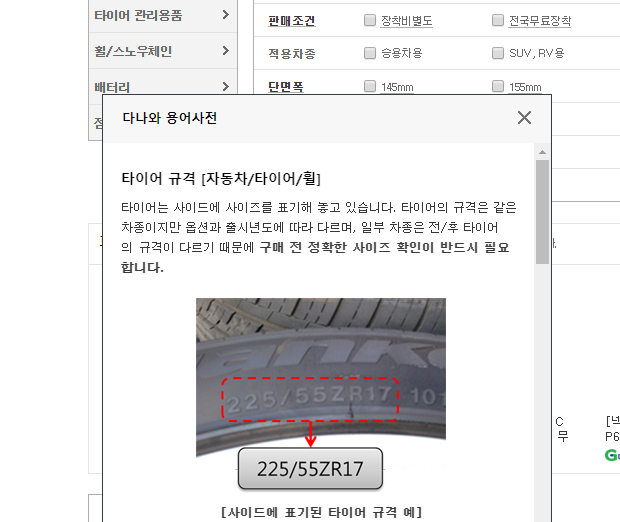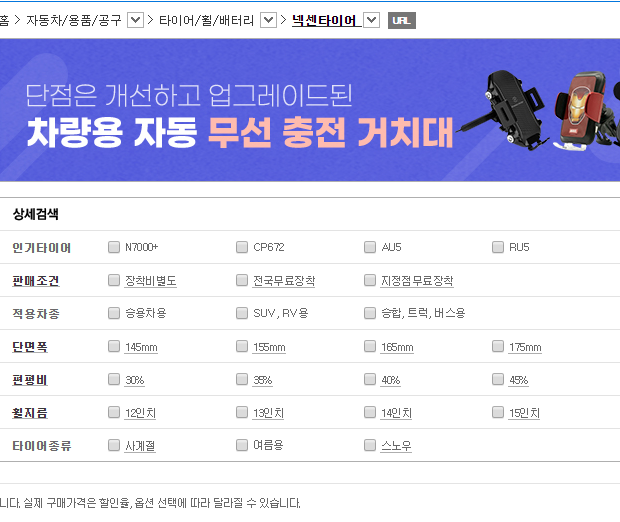 카테고리 메뉴를 누르면서 넥센타이어의 가격표가 있는 곳으로 이동을 했다면, 한 번 더 검색값을 지정하면서 선별을 해주세요. 각각의 항목은 마우스커서를 올리면 설명을 확인하실 수 있을 것입니다.