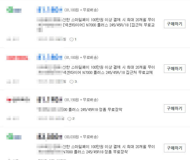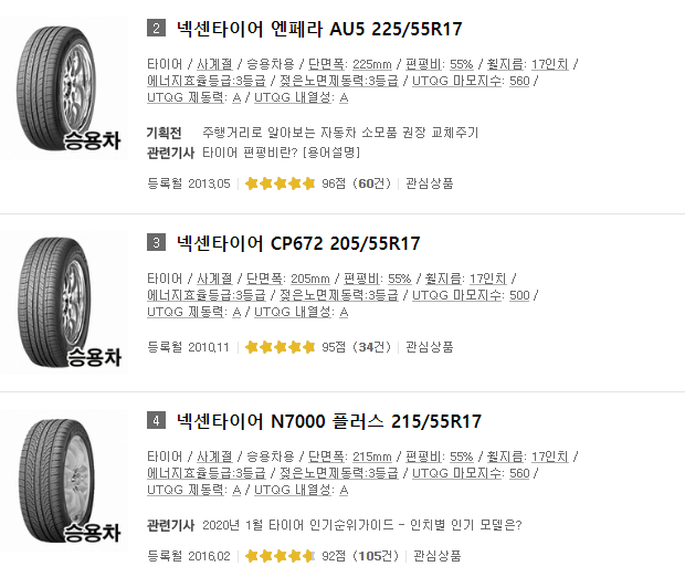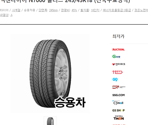 가장 가성비가 좋은 첫 번째 항목만 확인하는 것이 아니라 굳이 다른 넥센타이어의 가격표까지 살펴보는 이유는 첫 번째 항목이 막상 들어가보면 내용이 다른 경우도 있기 때문입니다. 특별한 문제가 없다면 첫 번째가 가장 좋겠죠?
