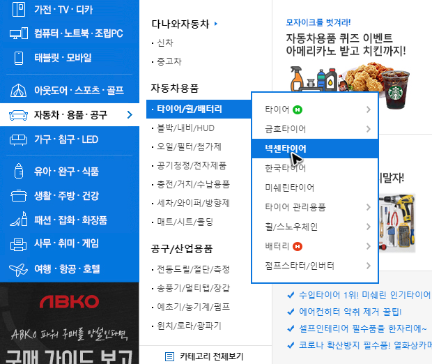 위에 적어둔 주소를 브라우저에 입력하면 아래 그림과 같은 페이지로 연결이 될 거예요. 여기에서는 왼쪽에 있는 카테고리 메뉴를 눌러서 넥센타이어의 가격표가 있는 곳으로 이동을 해주시면 됩니다.