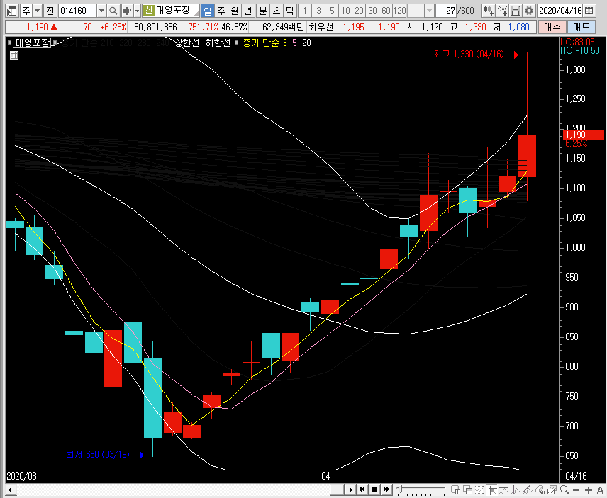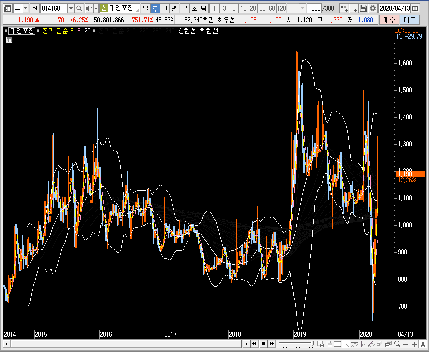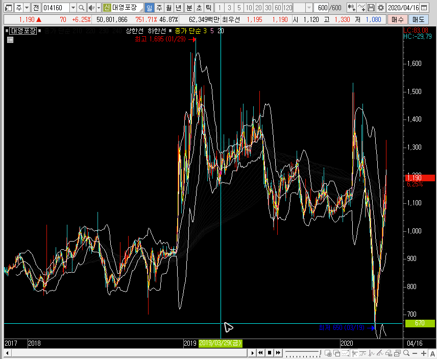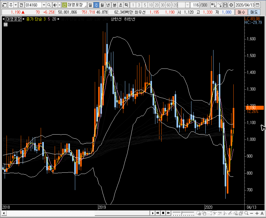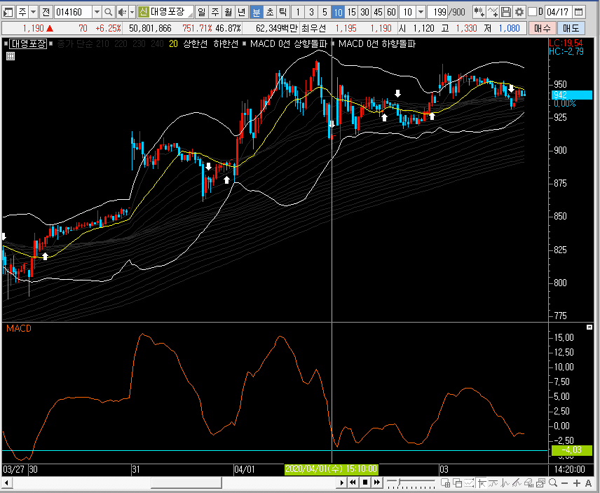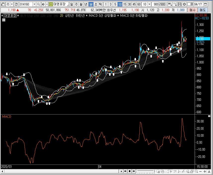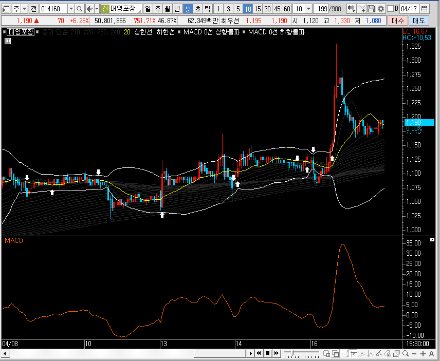 일봉차트에서는 뭉친 밴드를 위로 뚫어주는 모습이 나오는데, 지금 나오고 있는 대영포장의 주가에서 그림은 변동성으로 이어질 수도 있으니, 단기적인 관점은 철저히 단기적으로만 공략하는 것이 좋은 선택이겠죠.