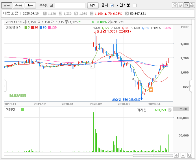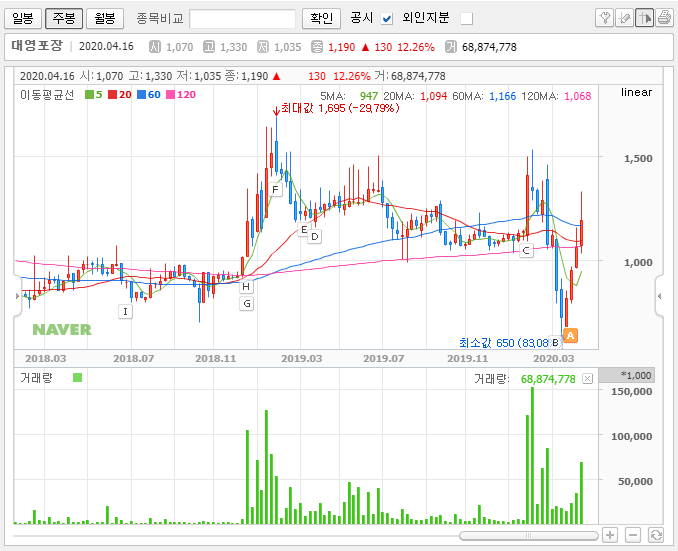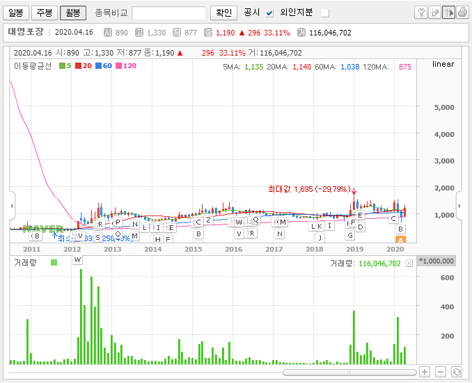 그래서 저는 대영포장의 주가에 충분한 매력이 있다고 생각합니다. 다만, 무작정 모으는 방식으로 가져가기엔 규모가 적당하지 않다고 봅니다. 그래서 차트를 보면서 대응하되 일부는 차익이 남는 구간이 되면 일부를 정리하고 일부만 길게 가져가는 것이 좋을 듯합니다.
