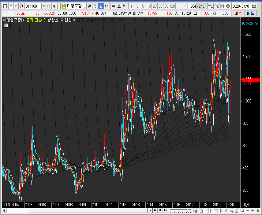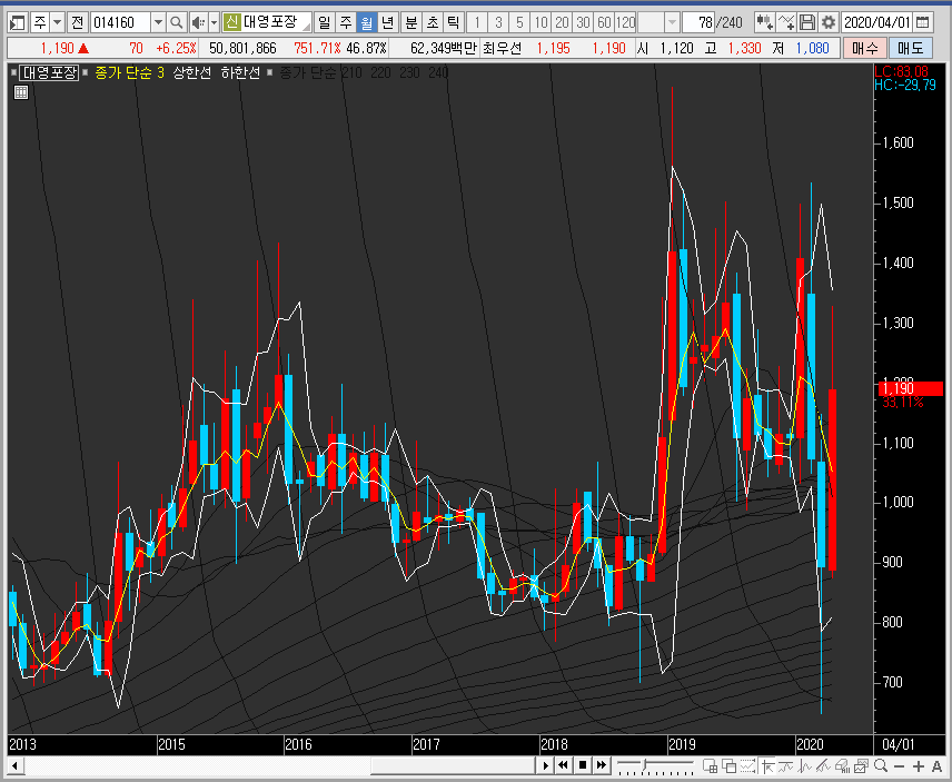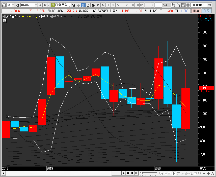 그런 의미에서 월봉차트로 대영포장의 주가를 보면 패턴상 음봉 마감 확률이 높은 자리에서 큰 양봉을 그리며 중심선을 한 번에 뚫어주는 모습을 보여주고 있습니다. 이 부분은 긍정적입니다.