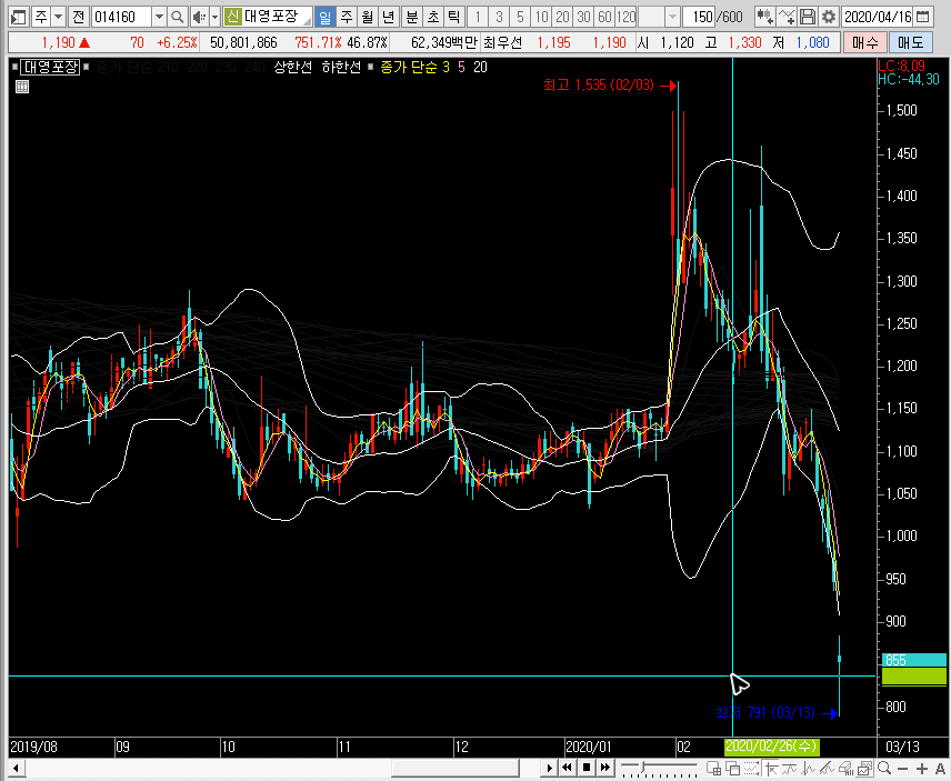 충분한 눌림이라 한다면 주봉차트에서 밴드 하단선을 다시 건드리는 상황이라 할 수 있겠죠. 그리고 단기적인 관점으로 대영포장의 주가를 공략할 땐 3일선이나 5일선과 만났을 때가 될 듯합니다.