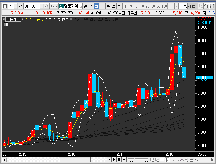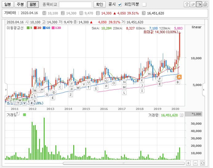 그래서 저는 장기적으로 가비아의 주가를 모으고 가져가는 방식도 나쁘지 않을 것으로 보고 있습니다. 월봉차트를 보면 최근 그림이 무너지기는 했지만, 여전히 꾸준하게 상승하는 추세를 유지하고 있습니다.