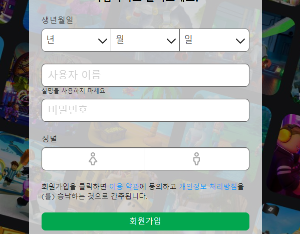 검색이나 주소 입력으로 공식 홈페이지를 찾아갔다면, 사용자 등록을 하는 부분이 보일 거예요. 로그인할 정보가 없는 상태라면 로블록스의 바로가기를 만들기에 앞서 빈칸을 채워주셔야 합니다. 로그인을 할 땐 우측 상단 버튼을 눌러주세요.