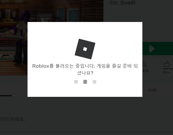 재생 버튼을 클릭하면 상자가 하나 튀어나와요. 그리고 뭔가 불러온다는 내용이 나오는데, 기다리고 있으면 로블록스의 바로가기를 만드는 버튼이 나옵니다. 클릭해서 다운로드를 해주세요.