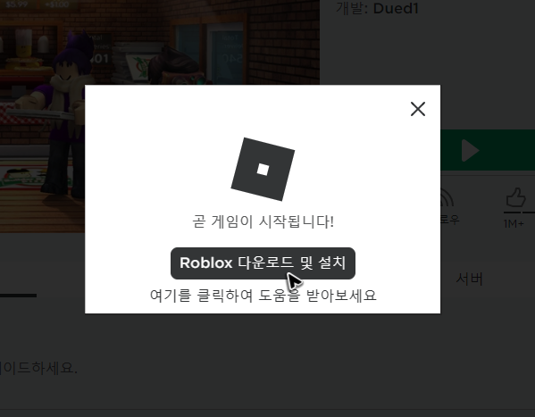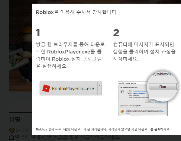 버튼을 클릭하면 파일이 받아지는 동시에 방금 띄워졌었던 상자의 내용이 바뀐 것을 알 수 있어요. 상자의 내용은 로블록스의 바로가기를 준비하는 과정에 대해 알려주고 있는데, 특별히 중요하지 않아서 무시해도 될 것 같습니다.