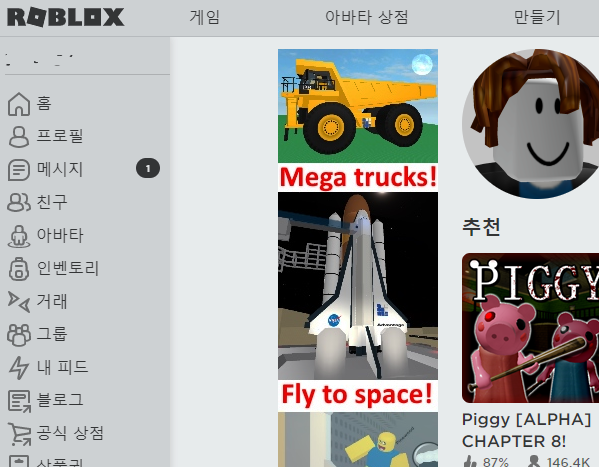 좌우간, 이렇게 로블록스의 홈페이지를 빠르게 찾아가고 실행을 할 수 있습니다. 페이지 왼쪽을 보면 아바타 설정이나 친구 등록과 같은 부가적인 기능들이 정리되어 있으니 둘러보시면 좋을 것 같습니다.