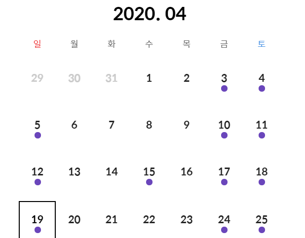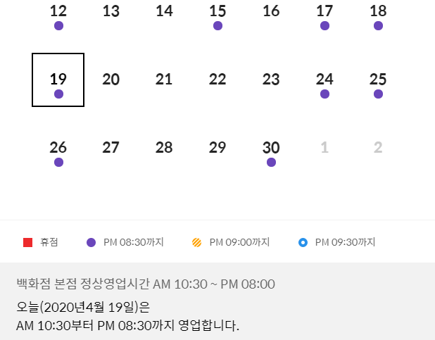 버튼을 누르면 달력이 하나 튀어나오는데, 만약 롯데백화점 본점의 휴무일이라면 달력에 빨간색 사각형이 표시됩니다. 그리고 문을 닫지 않는다면, 종료하는 시각에 따라 서로 다른 표시가 나타날 거예요.