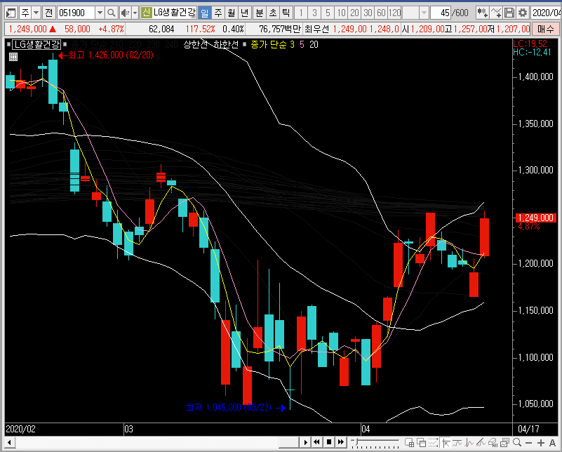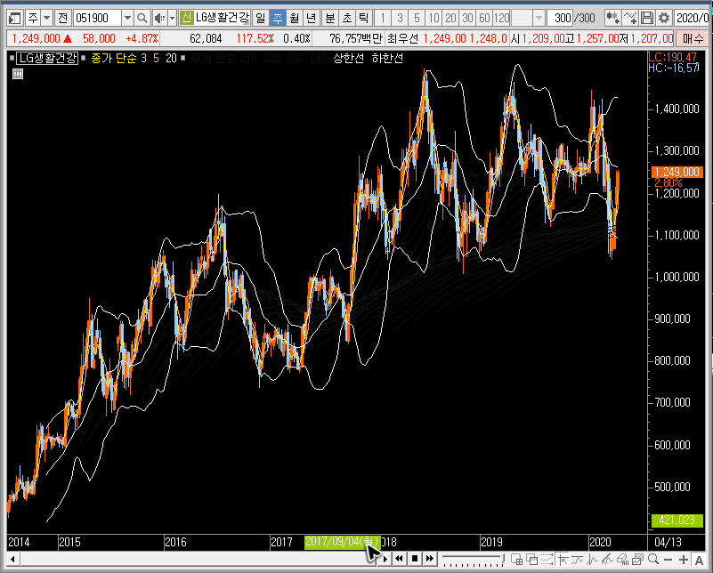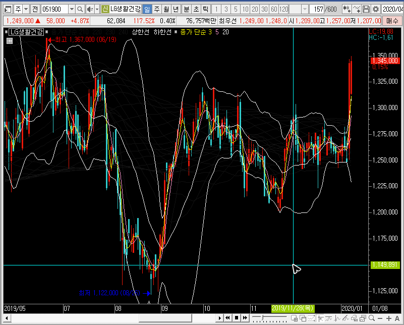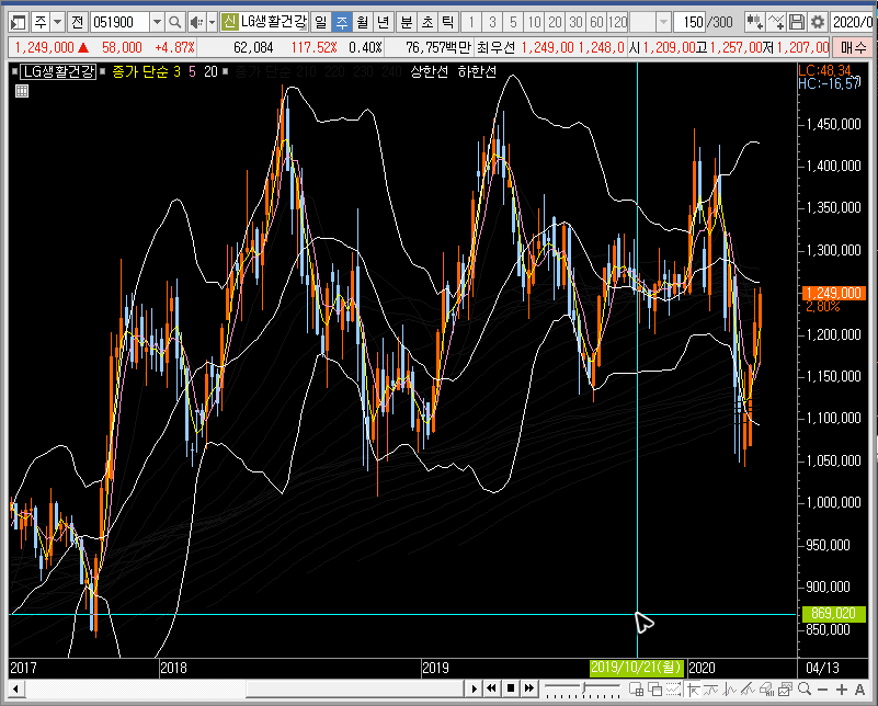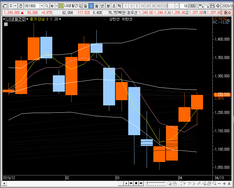 주봉차트를 보면 중심선 근처까지 오른 lg생활건강의 주가를 볼 수 있는데, 중심선의 각도가 가파르지 않고, 연달아 네 개의 양봉이 나오는 중이며 밴드도 확장된 상태입니다.