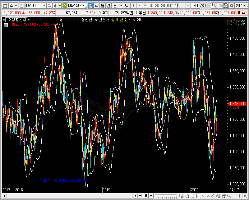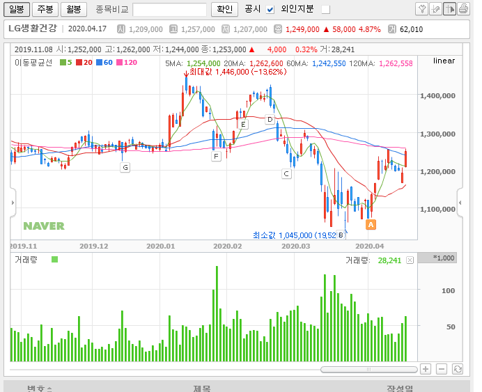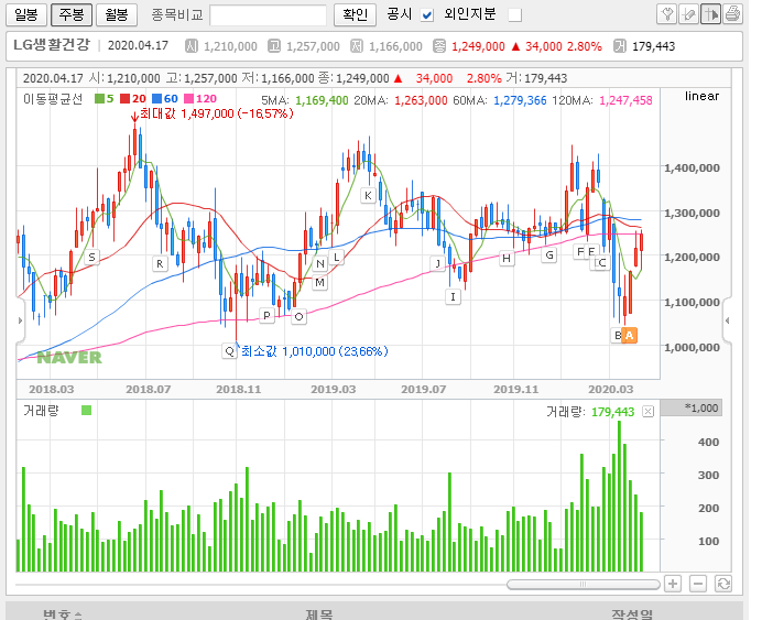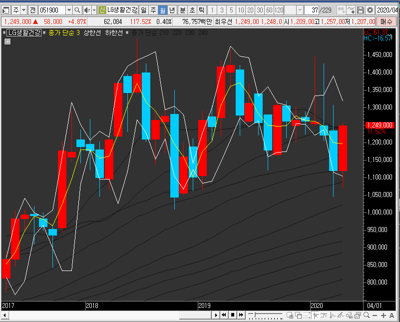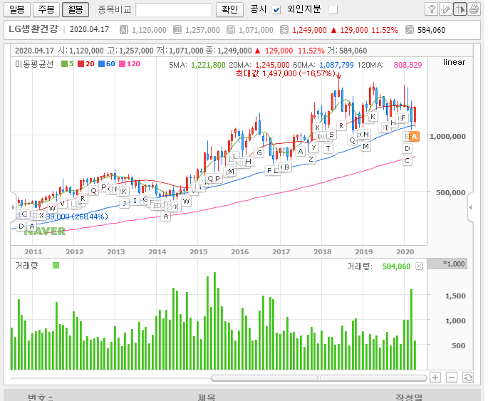 각설하고, 지금부터 lg생활건강의 주가에 대해 얘기를 해보겠습니다. 앞서 언급을 했듯이 우량주에 해당하는 종목입니다. 엄청 큰 재료가 있는 것은 아니지만, 종목 자체가 차트만 보면서 대응해도 무리가 없을 듯합니다.