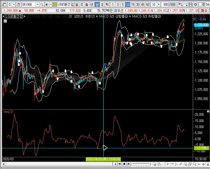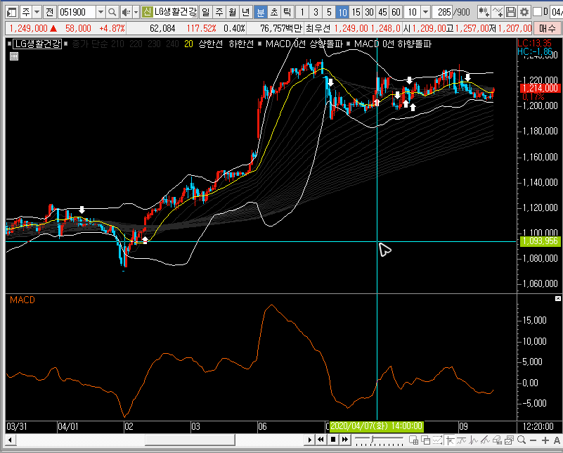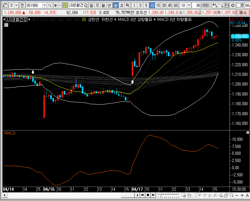 그래서 제가 만약 lg생활건강의 주가를 공략해야 한다면 저는 일단 기다릴 것 같습니다. 그리고 중심선을 올라탄 뒤에 중심선으로 조정을 받고 분봉에서 지지력을 보여줄 때부터 공략을 시작할 것 같습니다.