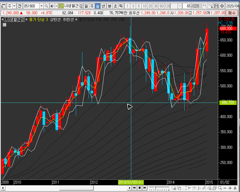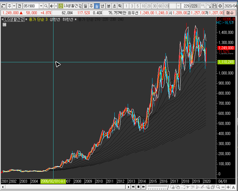 그런 의미에서 lg생활건강의 주가 차트를 보도록 하겠습니다. 월봉차트를 줄여서 보면 참 보기 좋은 그림을 그려가고 있는데, 초창기부터 이 종목을 갖고 계신 분들이 만약 있으시다면 정말 부러울 것 같군요.