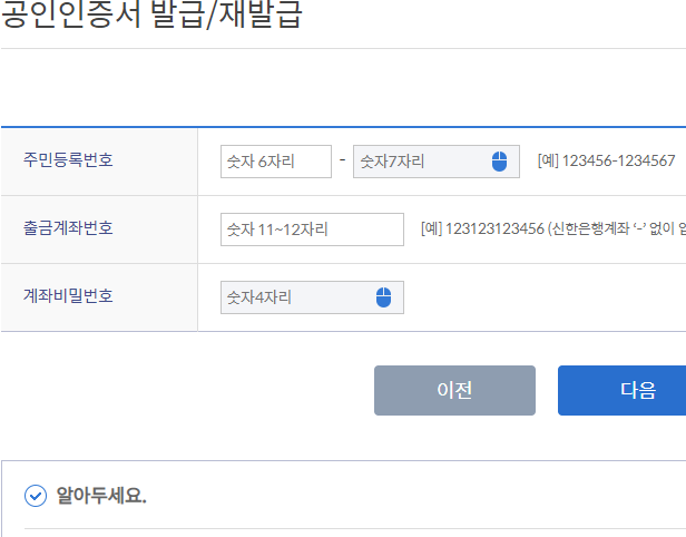 처음 신한은행의 공인인증센터를 찾아가면, 왠지 엄청 어려운 과정들이 기다리고 있을 것 같지만, 막상 사용을 해보면 그냥 빈칸을 채우는 과정이 전부입니다. 그래서 어렵다고 느껴지는 부분이 전혀 없을 거예요.