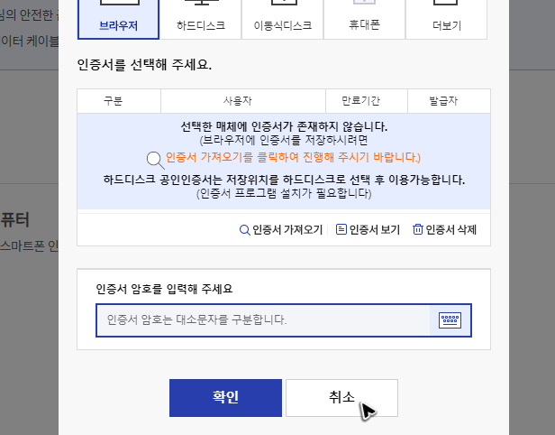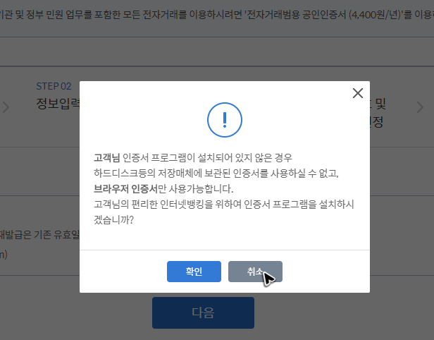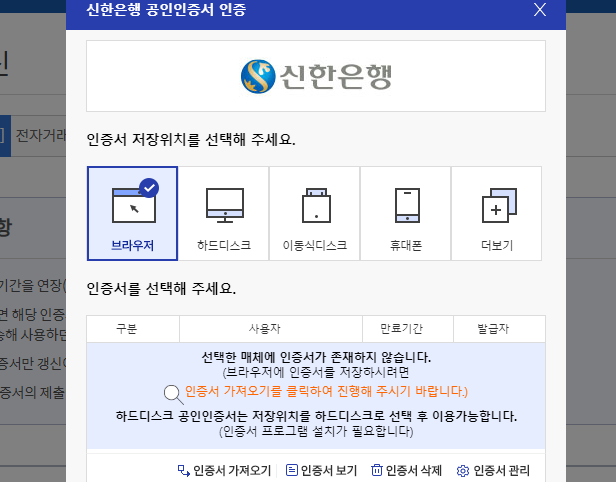 보안모듈을 준비하거나 생략한 뒤에 작업 화면으로 이동을 했다면, 그냥 신한은행의 공인인증센터에서 안내하는 과정을 순서대로 진행하기만 하면 됩니다.