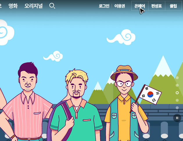 검색하거나 주소를 브라우저에 입력하고 엔터를 누르면, 아래 그림과 같은 페이지가 로딩이 될 거예요. 여기에서는 우측 상단에 보이는 imbc의 온에어을 누르기만 하면 됩니다. 정확한 위치는 커서가 있는 곳을 확인해주세요.