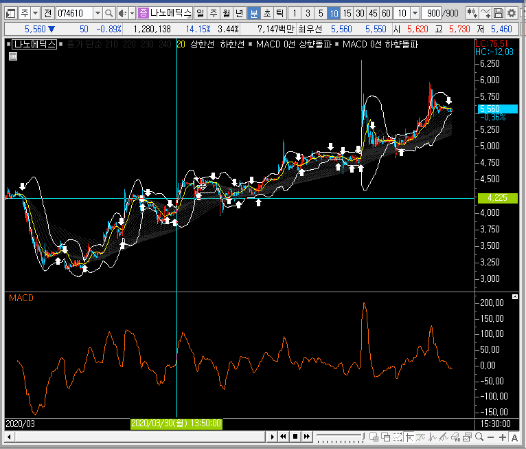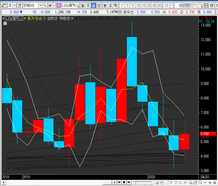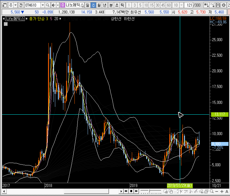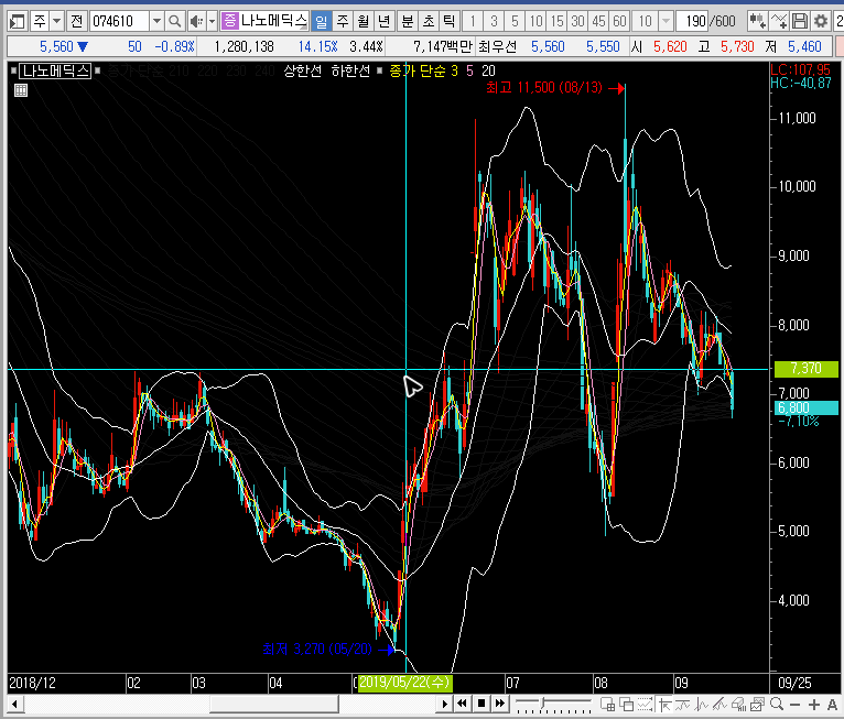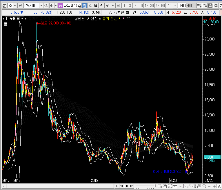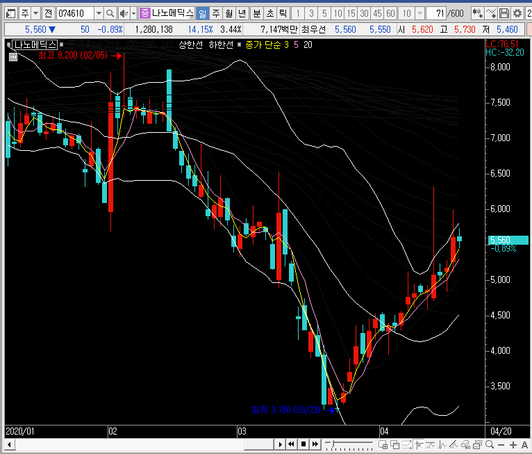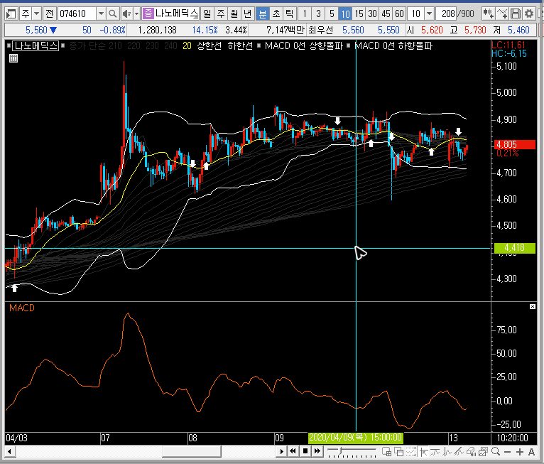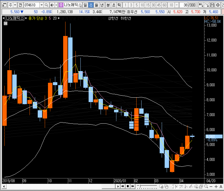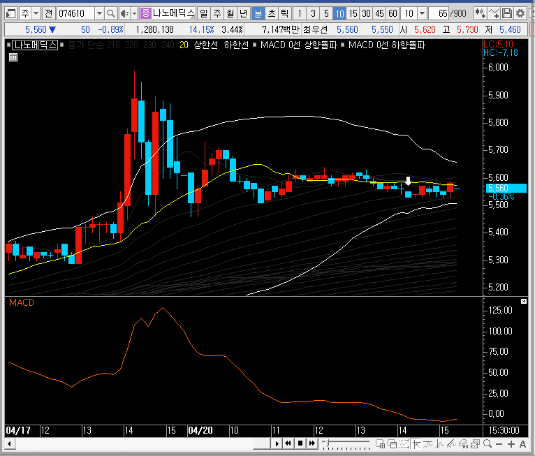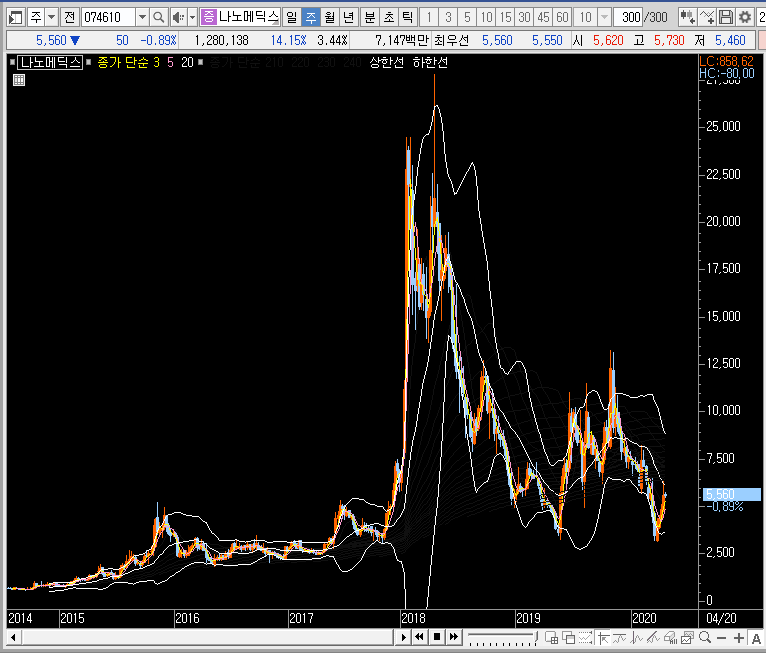 주봉차트를 보면 밴드 중심선에서 저항을 받는 나노메딕스의 주가가 보이는데, 이럴 땐 크게 두가지 포인트가 있을 것 같습니다. 밴드 하단과 중심선을 넘은 뒤 3일선 및 5일선이죠.