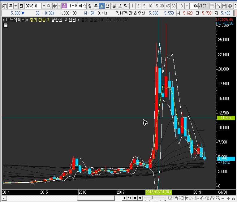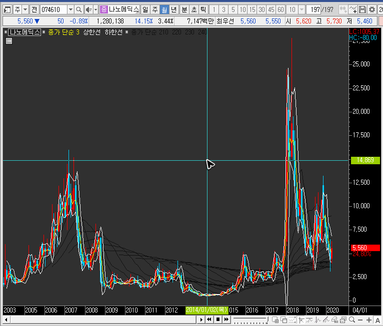 월봉차트를 줄여서 보면 뭉친 그물망을 한 번 지지했고, 지금은 그 그물망을 다시 지지하는 것 같은 모습을 보여주고 있습니다. 재료와 관련된 새로운 소식이 전해지면 나노메딕스의 주가는 전고점을 넘을 수 있는 패턴이 완성되겠죠.