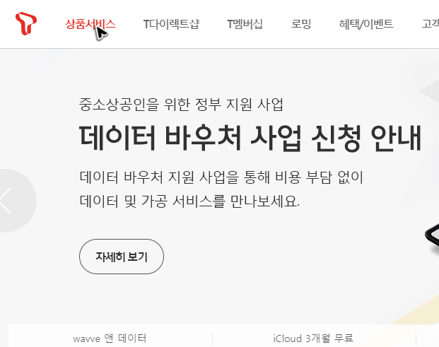 티월드 홈페이지를 찾아갔다고 해서 바로 skt 알뜰폰의 요금제가 보이지는 않을 거예요. 여기에서 몇 가지 버튼을 눌러주어야 하는데, 일단 왼쪽 상단의 상품서비스를 눌러주세요. 그리고 세부 카테고리 메뉴의 첫 번째 항목을 눌러주세요.