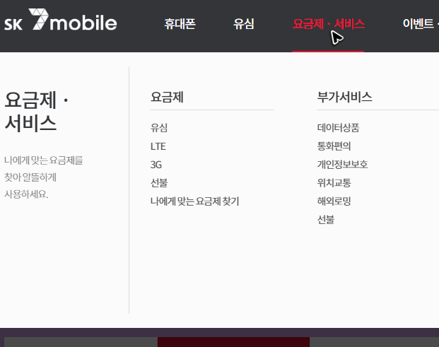 다른 홈페이지 역시 디테일한 모습만 다를 뿐 카테고리 메뉴에 skt 알뜰폰의 요금제를 알아볼 수 있는 항목이 있어서 내가 원하는 유형을 알아보는 것에 큰 어려움이 없을 것 같습니다.