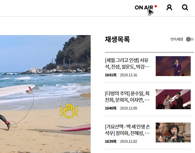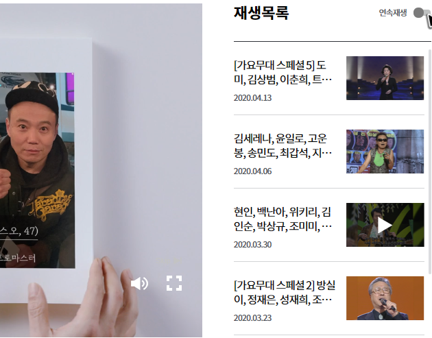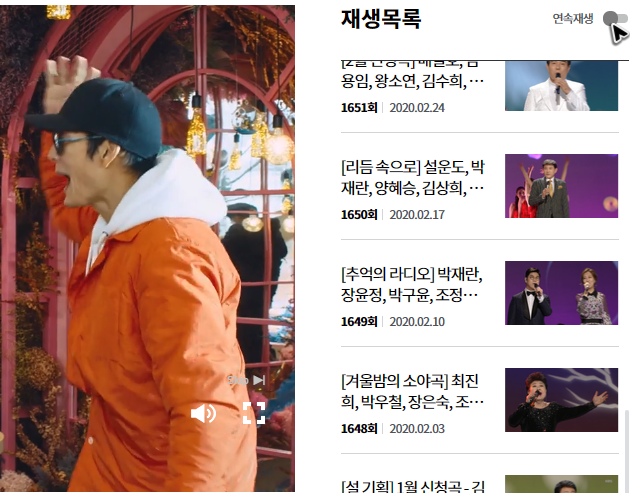여담으로 플레이어 오른쪽을 보면 회차가 한 번 더 정리되어 있고, 연속재생 기능도 보여요. 여러 회차를 가요무대의 다시보기하는 것이라면 연속재생 기능을 켜두시면 더 좋을 것 같아요.