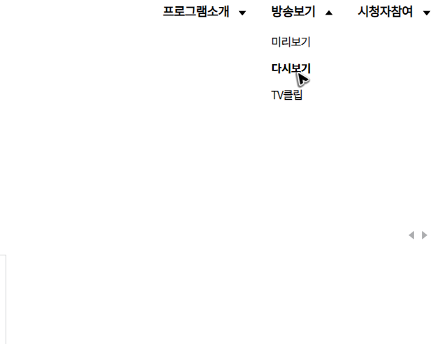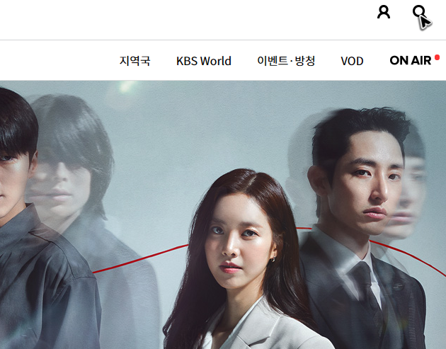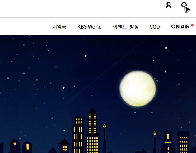 주소를 브라우저에 정확하게 입력했다고 하더라도 가요무대의 다시보기를 하는 공간이 바로 보이지는 않을 거예요. 몇 가지 버튼을 더 눌러서 찾아야 합니다. 우선 우측 상단의 돋보기부터 눌러주세요.