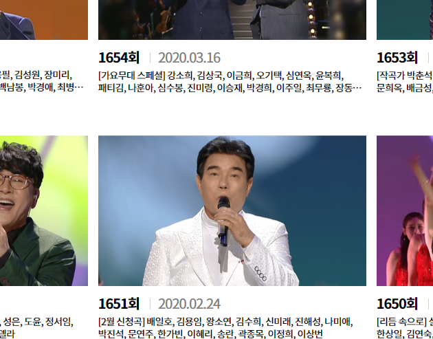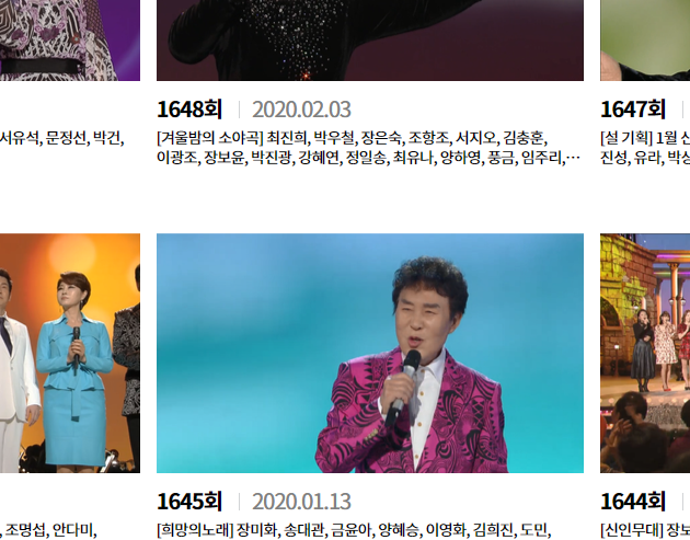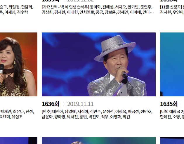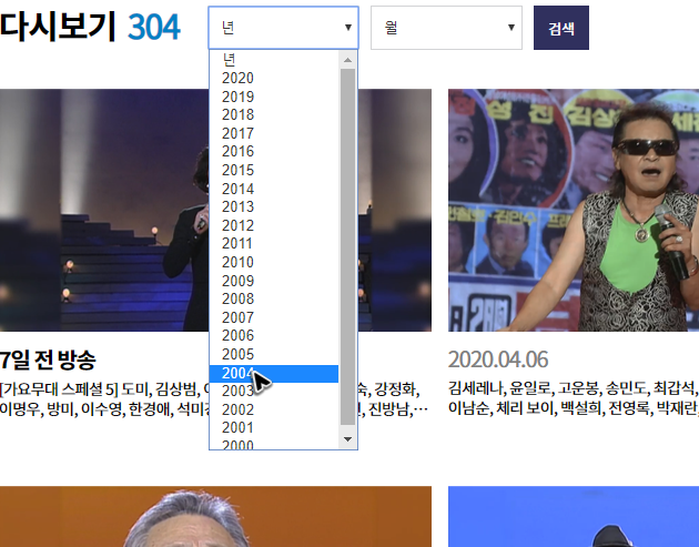 혹시 예전에 방영된 회차를 보고 싶으신 상황이라면, 하나씩 목록을 둘러보면서 가요무대의 다시보기를 할 회차를 찾는 것보다는 위쪽에 있는 방영시기를 고르는 버튼을 활용하시는 것이 더 편하실 거예요.