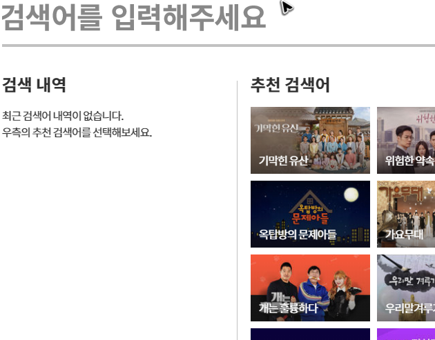 버튼을 누르면 새로운 화면이 열리고, 그 화면 위쪽에는 검색하는 영역이 보일 거예요. 우리는 가요무대의 다시보기를 하기 위해서 여기를 방문한 것이니, 이 프로그램의 이름을 검색하면 되겠죠?