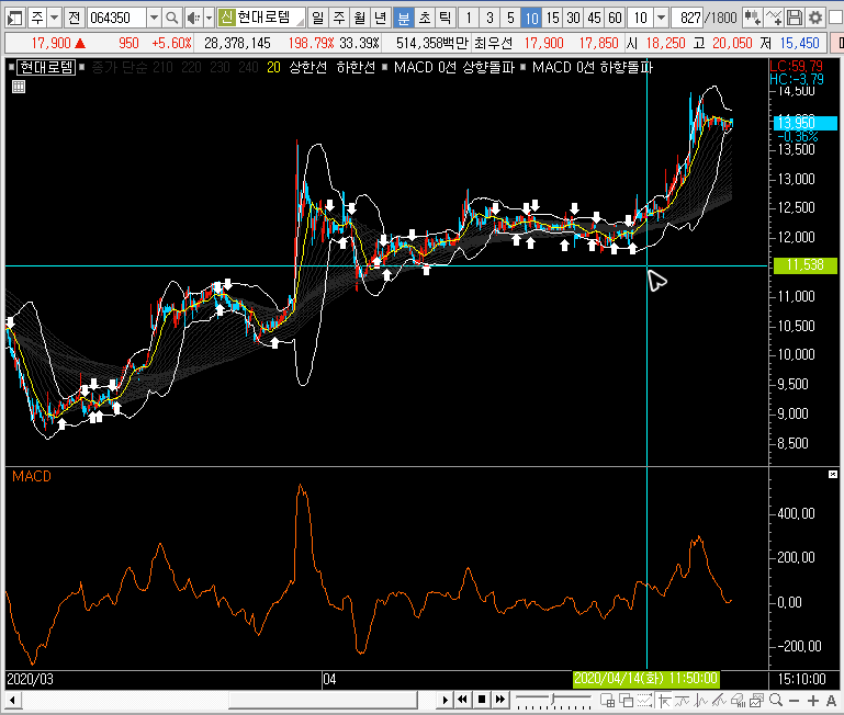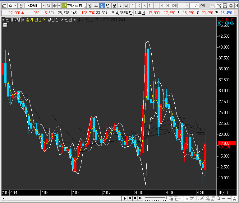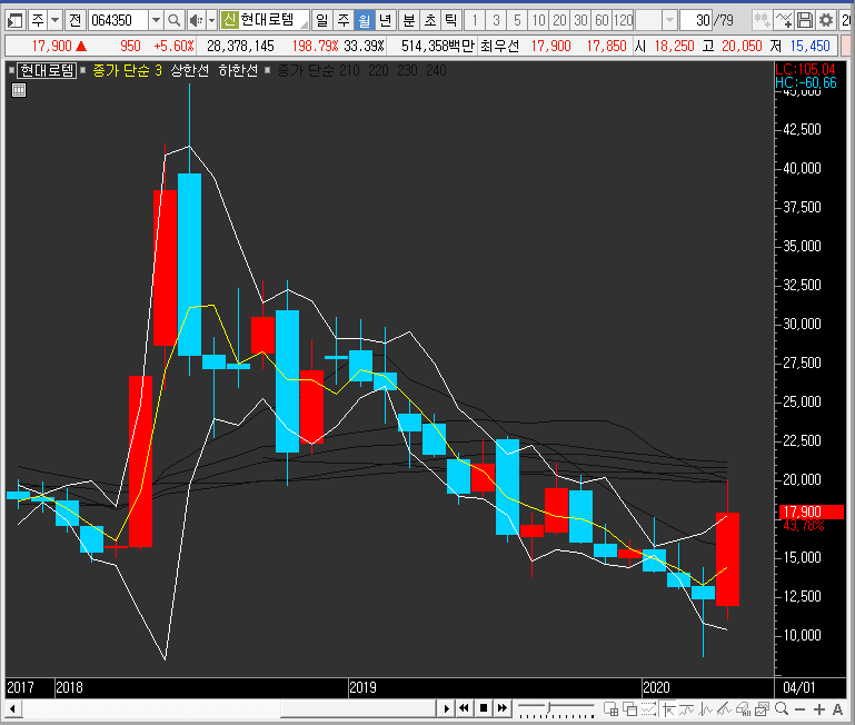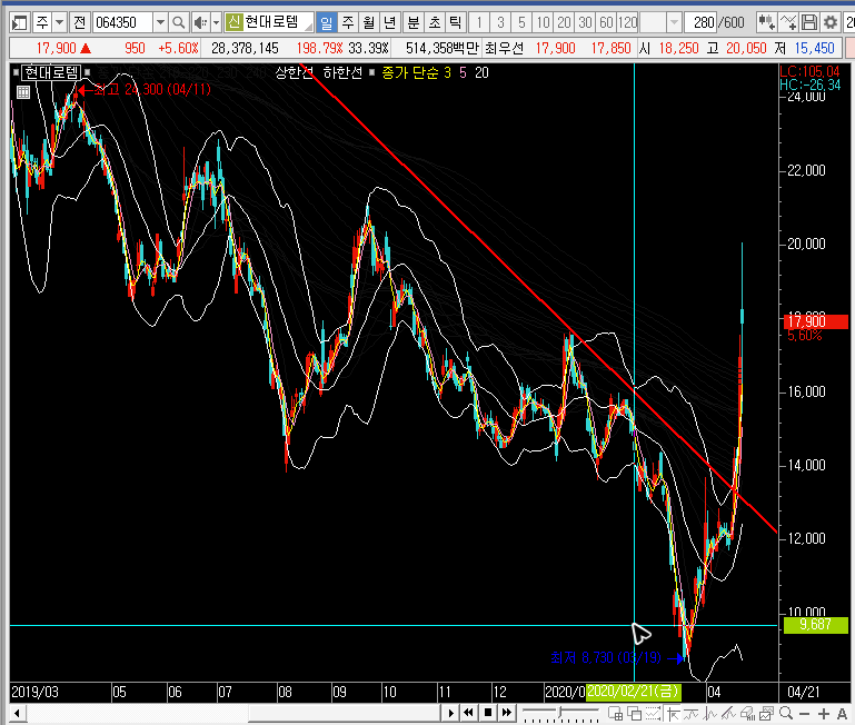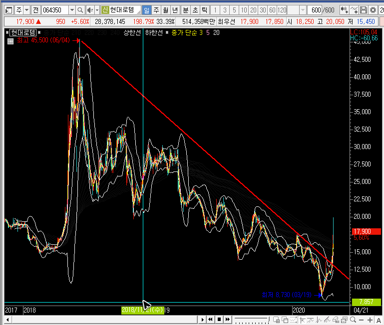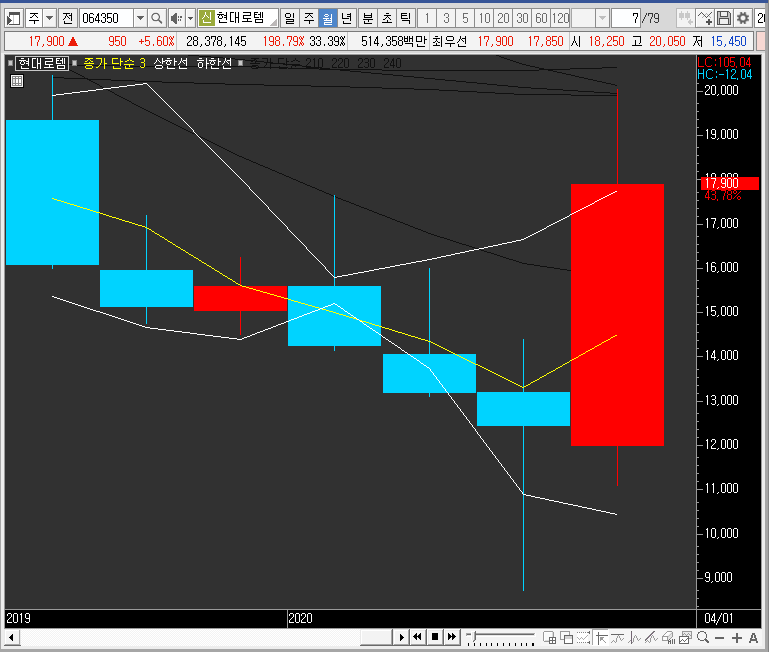 다만, 월봉차트나 중봉차트로 봤을 때 현대로템의 주가는 저항을 건드리고 있는 상황입니다. 즉, 중간에 끼어서 어디로 튈지 가늠하기 어려운 자리에 있는 상황이라 할 수 있을 것 같아요.