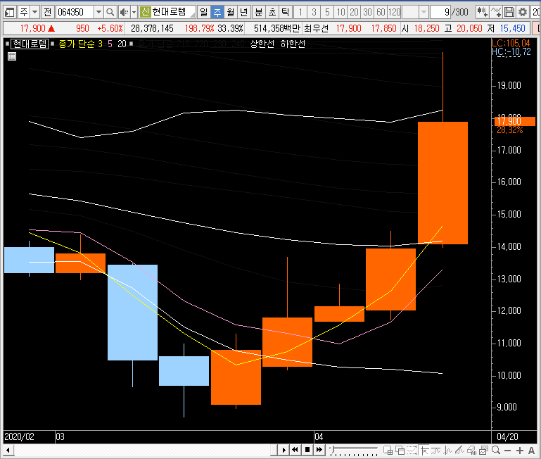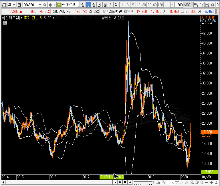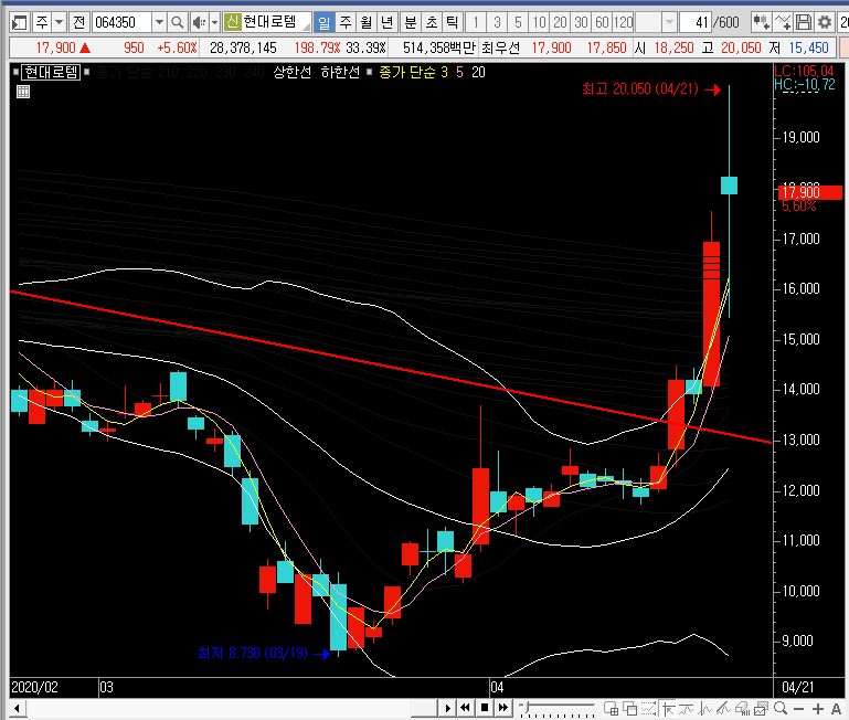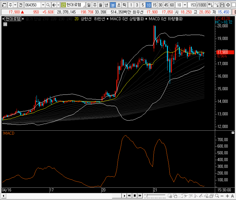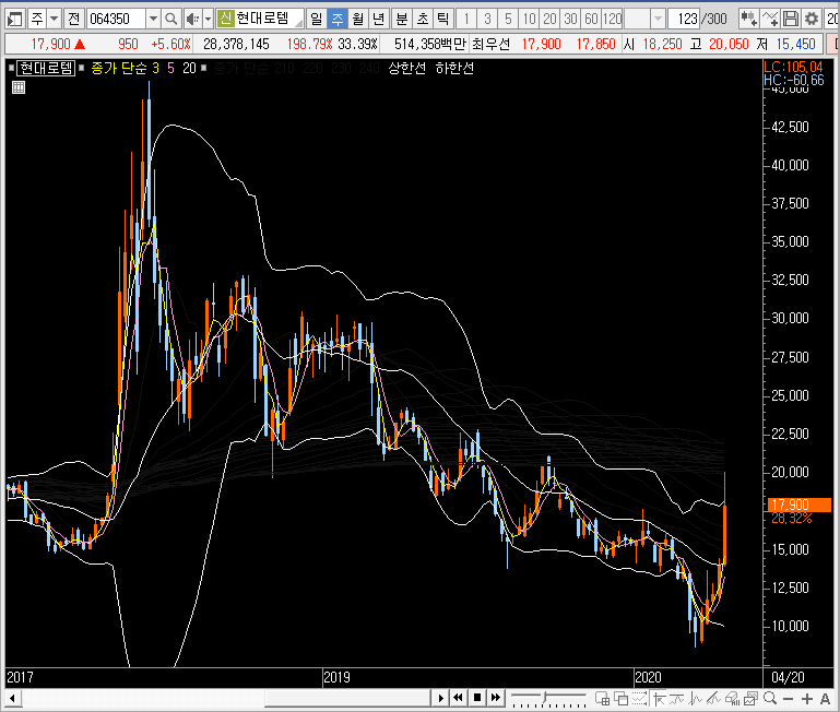 제가 만약 현대로템의 주가를 공략해야 한다면, 주봉차트에서 그물망이 뚫리고 그 자리를 지지할 때를 기다릴 것 같습니다. 테마라는 것이 소식 하나하나에 변동폭이 엄청 커질 수 있기 때문에 지금 일봉 자리를 보면서 들어가는건 너무 위험하게 느껴집니다.