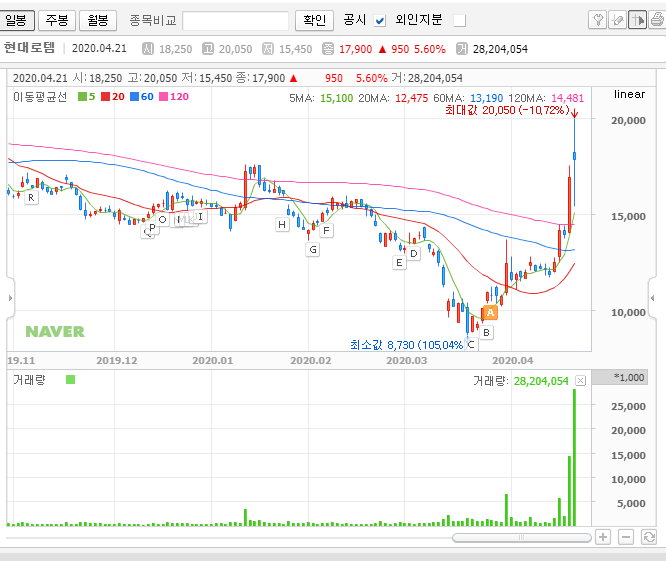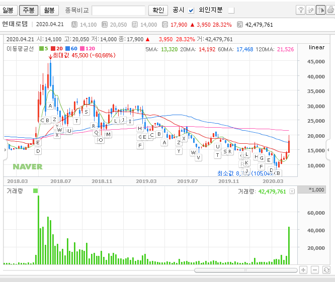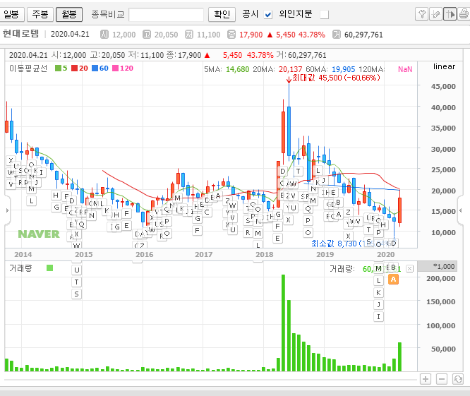 현대로템 주가 흐름 체크 : 대표적인 북관련 테마주 중 하나이고, 요즘 철도사업이 다시 시작된다는 소식이 전해지면서 뜨거운 관심을 받고 있는 종목이기도 하죠?