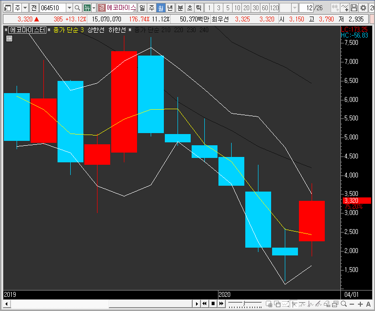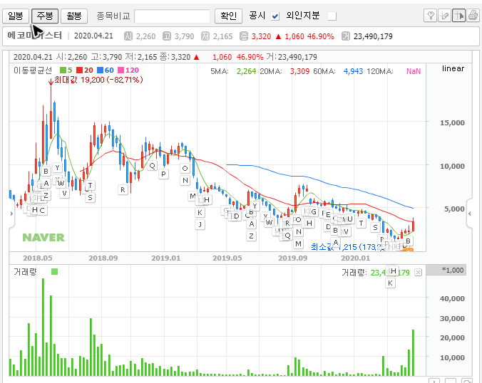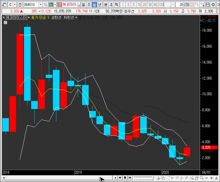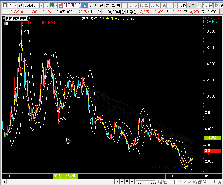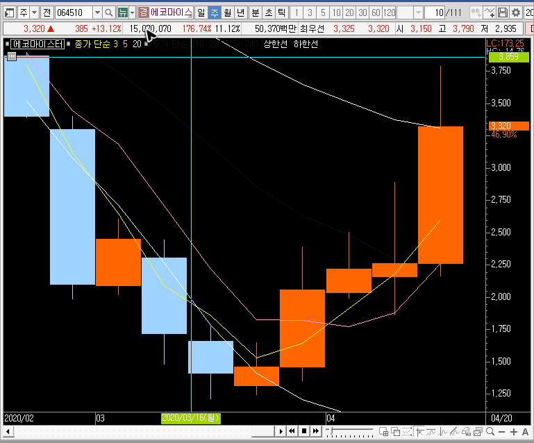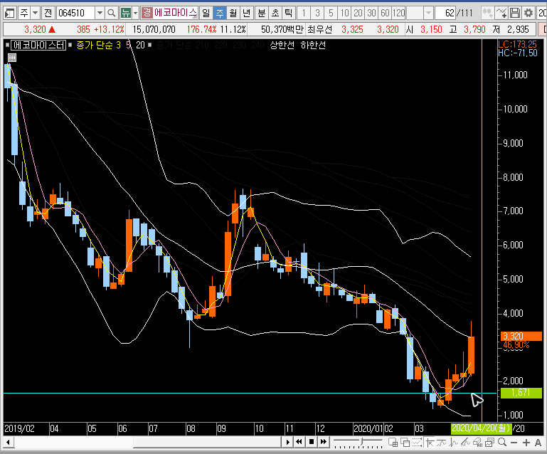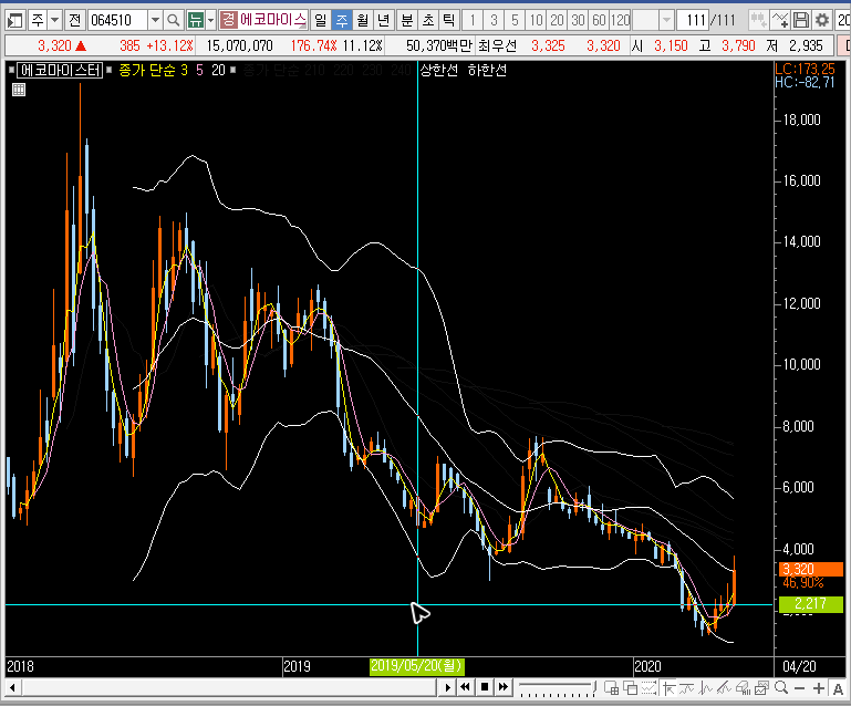 정말 공격적으로 접근을 한다면, 주봉차트의 중심선이 뚫릴 때 따라서 들어가볼 수도 있을 것 같기는 한데, 역시나 이런 에코마이스터의 주가를 공략하는 것은 난이도가 너무 큽니다. 많은 위험을 감내해야 해요.