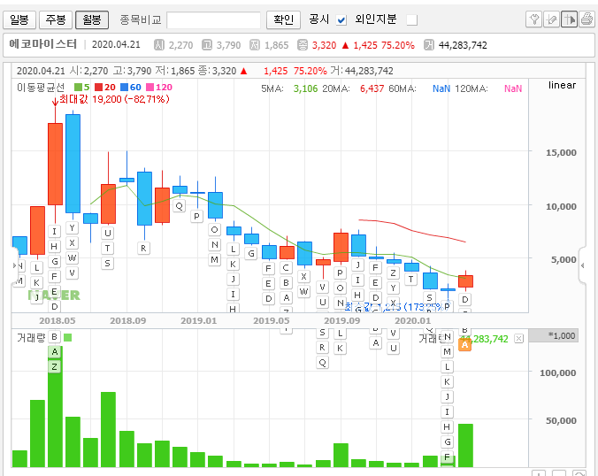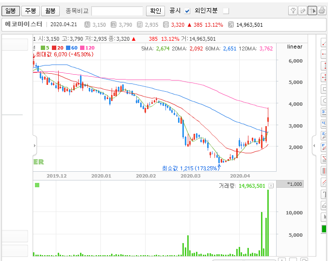 그럼 지금부터 에코마이스터의 주가에 대해 얘기를 해보도록 하겠습니다. 지극히 개인적인 생각이지만 저는 이 종목처럼 실적은 없는데 테마만 타는 종목들을 꺼리는 편입니다.