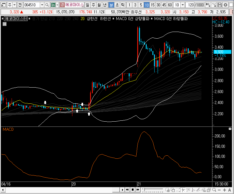 결국 제가 보는 에코마이스터의 주가는 진작에 포지션을 잡았었던 분들이 일부를 정리하고 남은 것으로 더 큰 흐름을 기다려보는 자리일 뿐, 아직까지 포지션이 없는 상황에서 신규로 진입하는 것은 조금 무리가 있다고 생각합니다.