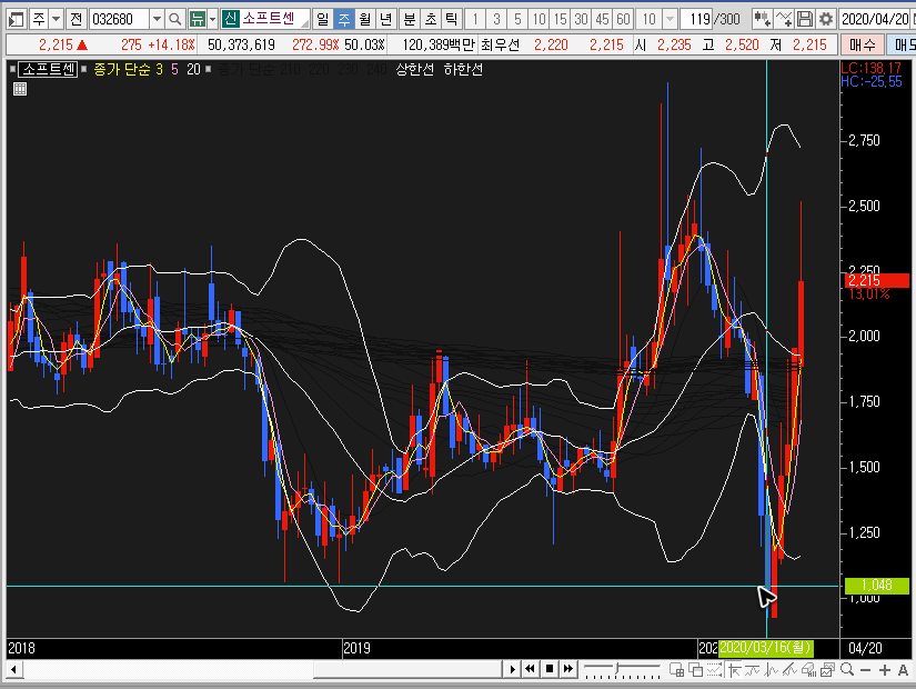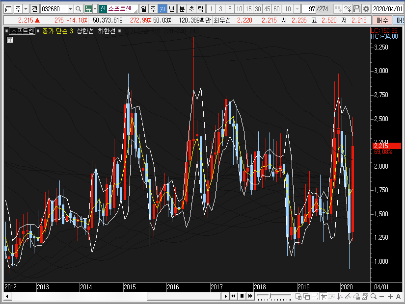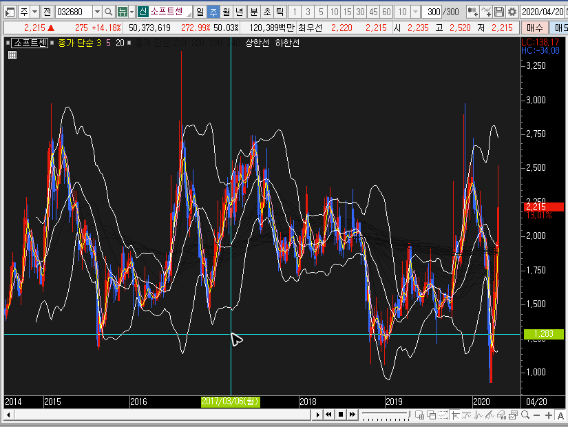 저항을 건드렸다는 이유로 무조건 소프트센의 주가가 하락할 것이라는 의미는 아닙니다. 주봉차트에서 아직은 밴드 상단이 조금은 열린 상태이니, 추가적인 상승이 있을 수도 있습니다.