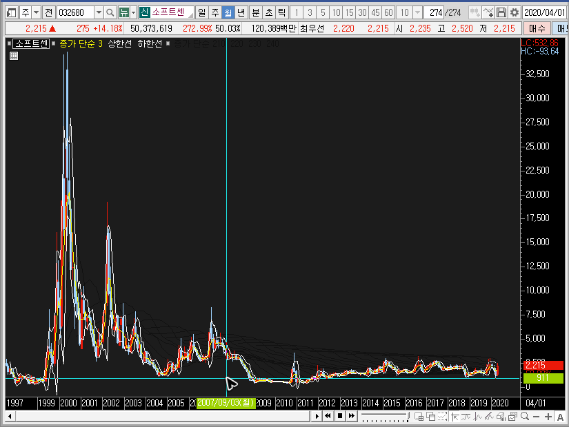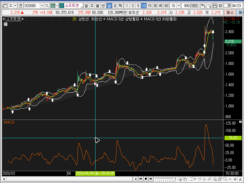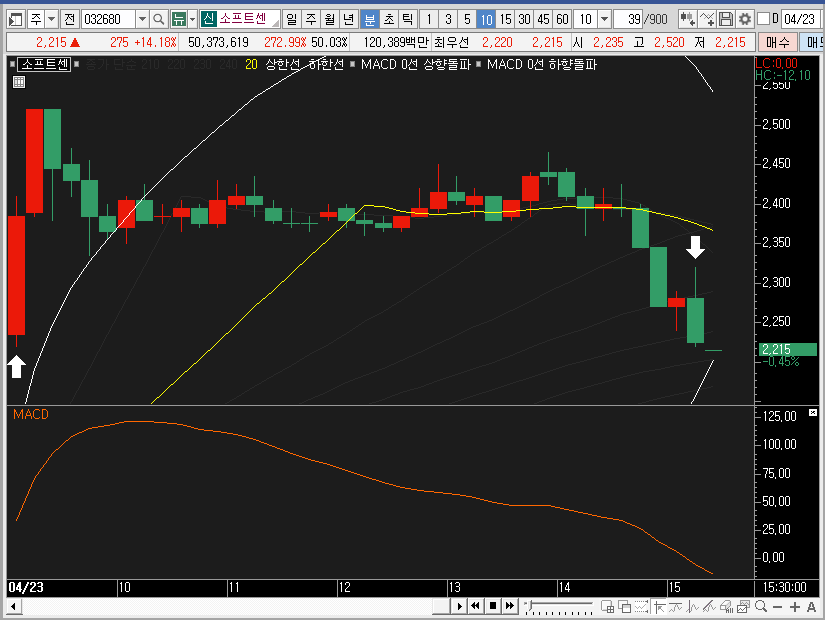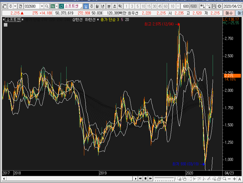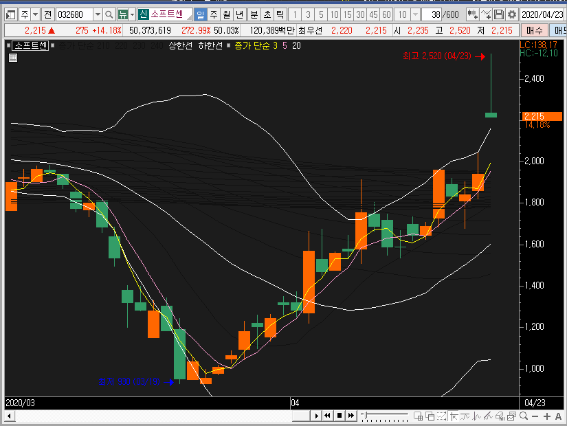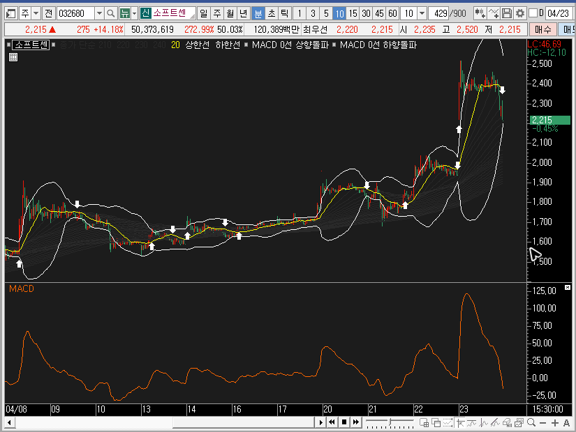 그래서 만약 제가 관심종목에 소프트센을 넣어두었고, 이 종목이 이런 상승파를 보여주기까지 별다른 공략을 하지 않았다면, 아쉽지만 그냥 관심종목에서 삭제를 할 것 같습니다.