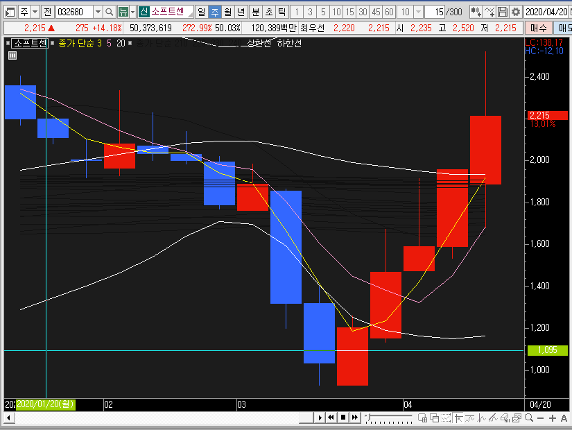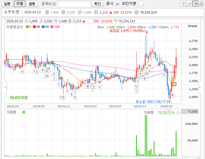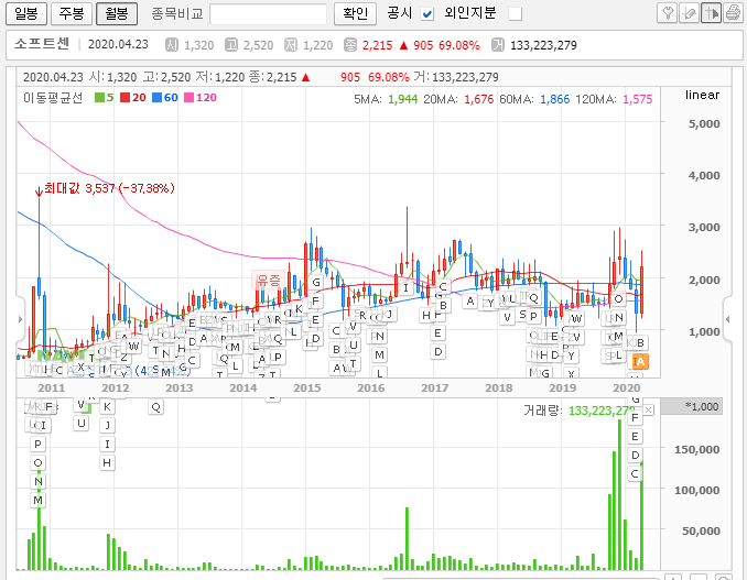 다만, 많이 오른 상황이고, 주봉에서 단기선을 여러 번 지지한 흔적도 있으니, 새롭게 소프트센의 주가를 공략하는 것은 전문가의 영역이라는 것이죠.