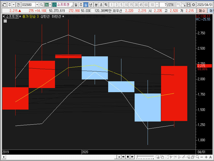 월봉차트에서 소프트센의 주가를 보면 큰 양봉을 보여주면서 강력한 힘을 느끼도록 해주었지만, 당장에는 수충하는 밴드 상단을 건드리며 저항을 받고 있습니다.