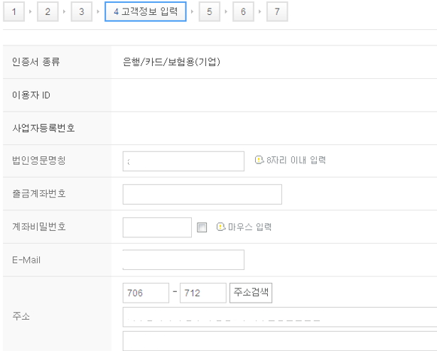 버튼을 누르고 다시 한 번 페이지 이동을 하면, 이번에는 빈칸들이 보일 거예요. 지금부터는 그냥 빈칸을 적당히 채우면서 대구은행 공인인증서를 재발급하면 됩니다.