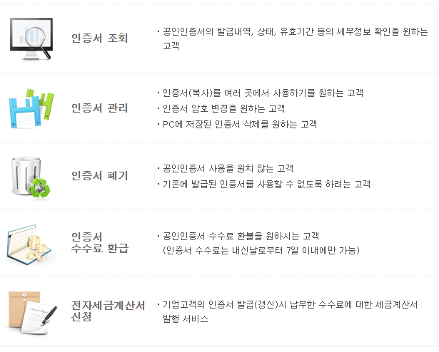 여담으로 이번에 홈페이지에 있는 메뉴들을 둘러보셔서 이미 아시겠지만, 이렇게 대구은행 공인인증서를 다시 만드는 것 외에도 기간을 늘리거나, 파일 위치를 바꾸거나, 파일을 안전하게 삭제하거나, 다른 곳에서 만든 파일을 여기에 등록하거나 등등, 파일을 관리하는 것과 관련된 모든 기능들이 있으니 그때그때 메뉴를 눌러서 활용하시면 될 것 같습니다.