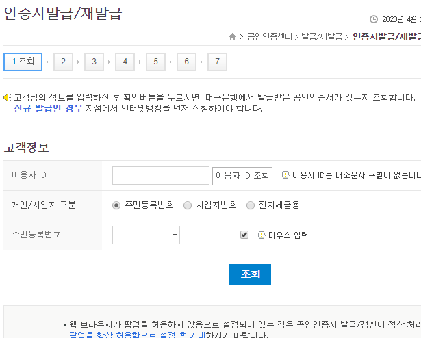 총 일곱 단계가 준비되어 있는데, 특별히 까다롭거나 어려운 부분이 없어요. 그래서 제가 세세하게 대구은행 공인인증서를 재발급 방법을 정리해두지 않더라도 무난히 작업을 끝내실 수 있을 것이라 생각합니다.