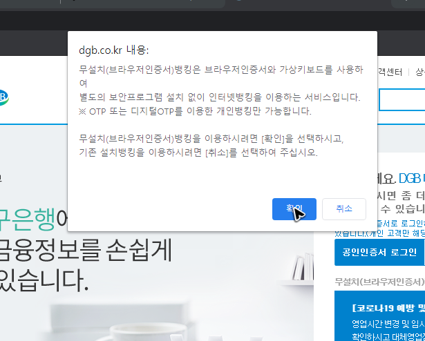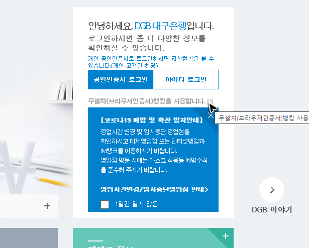 여담으로 대구은행 공인인증서를 재발급을 할 때 보안모듈을 준비해야 한다는 내용이 나올 수 있는데, 혹시 설치하는 것이 꺼려진다면 첫 화면에서 무설치 항목에 체크를 해주시면 됩니다.