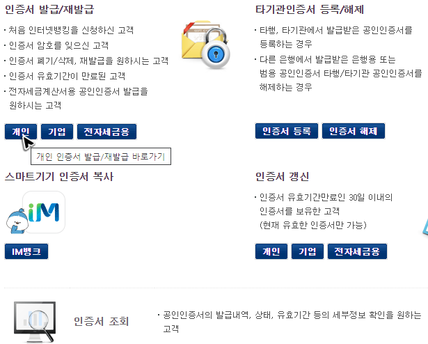 카테고리 메뉴를 누르면 여러 메뉴들이 정리된 곳으로 이동하게 될 거예요. 이 중에서 필요한 작업을 선택하면 되는데, 우리는 대구은행 공인인증서를 재발급하기 위해 찾은 것이니, 첫 번째 그룹의 개인을 누르면 되겠죠?