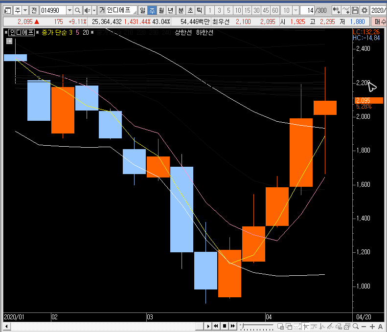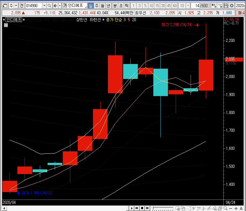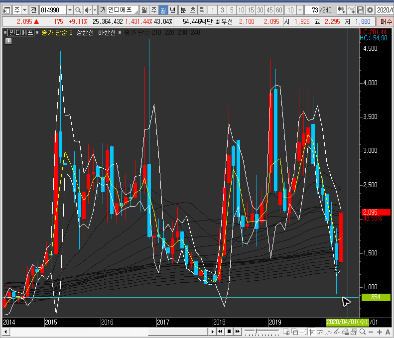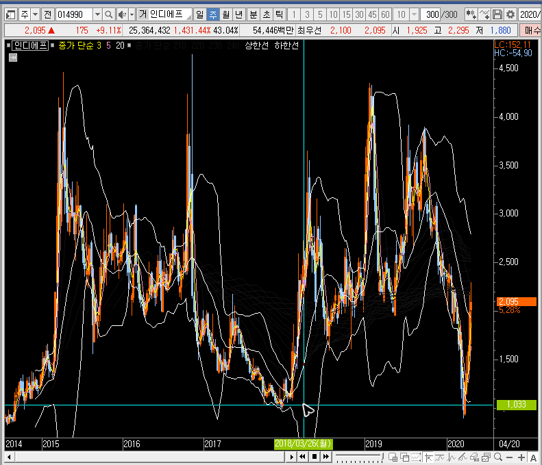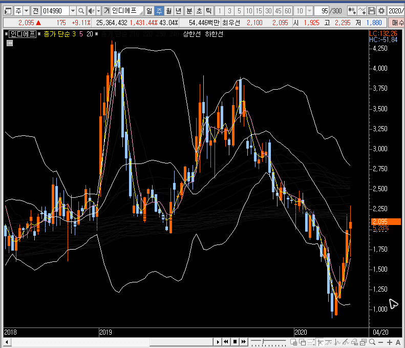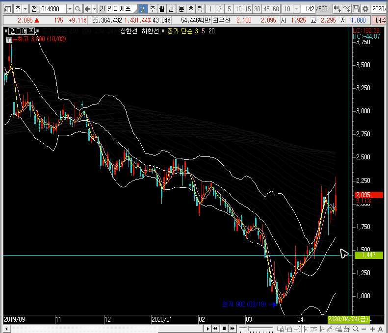 월봉차트에서 밴드 상단선을 건드린 상태이고, 주봉차트에서 인디에프의 주식은 단기선을 여러 번 지지하며 올랐습니다. 위쪽으로 조금 열린 구간이 있지만 장기적인 관점으로 보기엔 적당하지 않은 자리죠.
