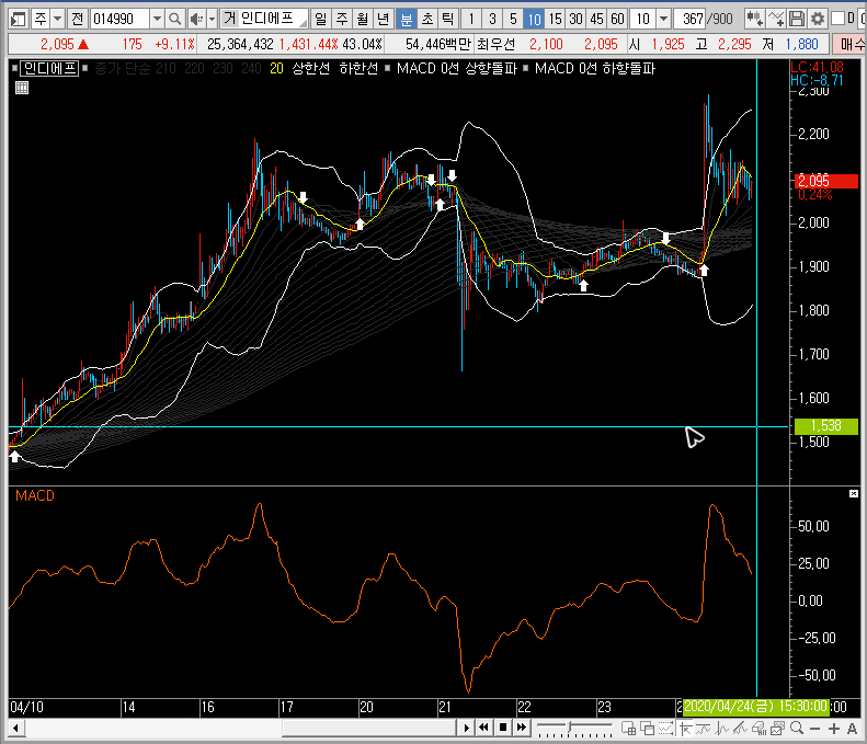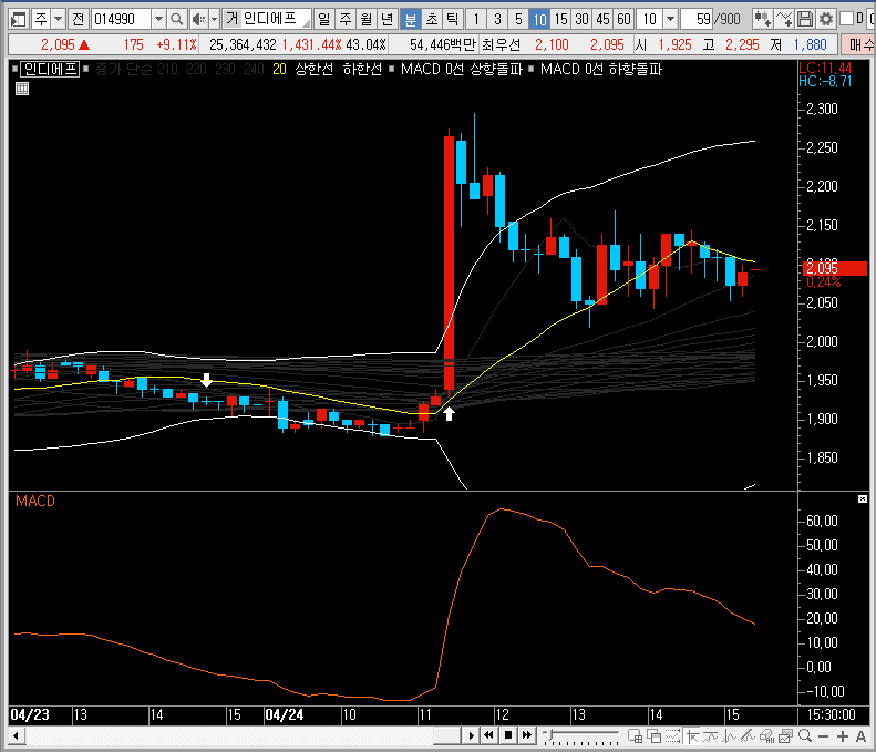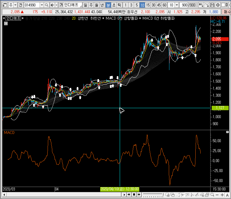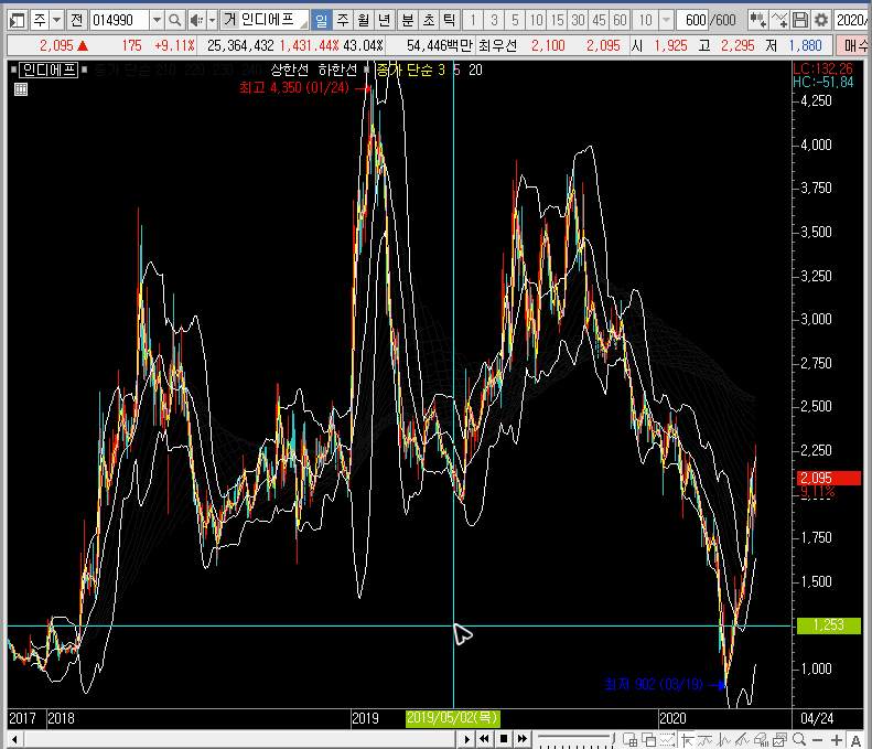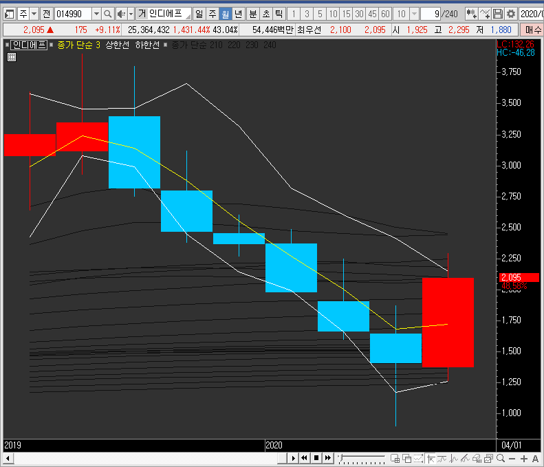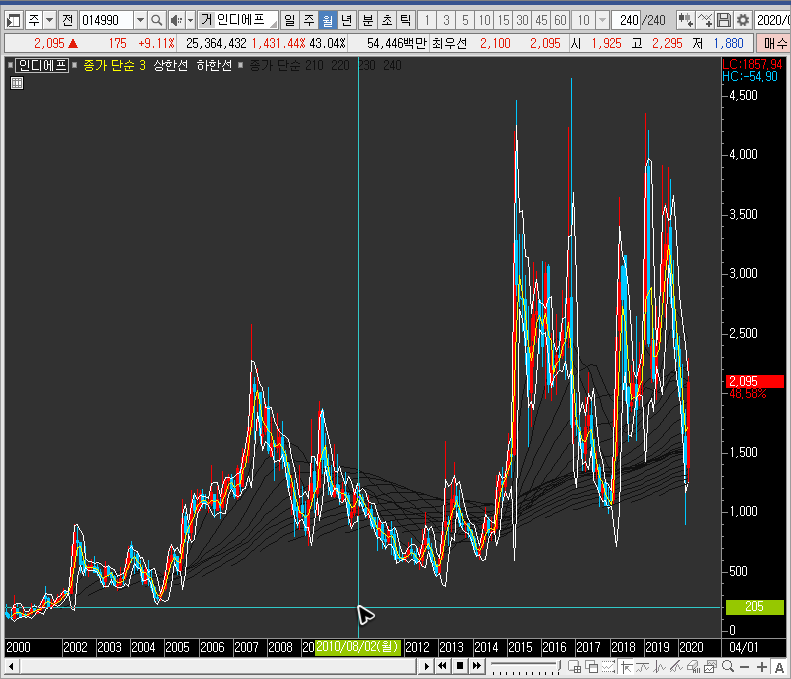 월봉차트에서 밴드 상단선을 건드린 상태이고, 주봉차트에서 인디에프의 주식은 단기선을 여러 번 지지하며 올랐습니다. 위쪽으로 조금 열린 구간이 있지만 장기적인 관점으로 보기엔 적당하지 않은 자리죠.