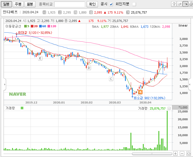 다만, 애초에 테마라는 것은 시장에서 소문이 나기 시작하며 이미 늦었을 확률이 높습니다. 차트를 보면 인디에프의 주식이 많이 오른 상태인데, 기대감일 뿐인 지금의 소식들이 이미 모두 반영되었을 확률도 무시할 수가 없습니다.